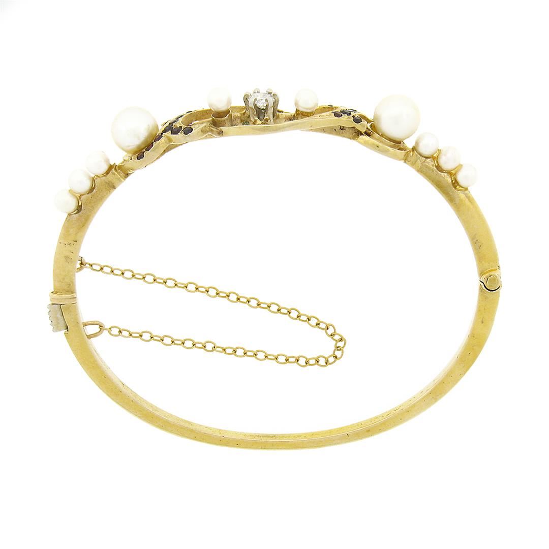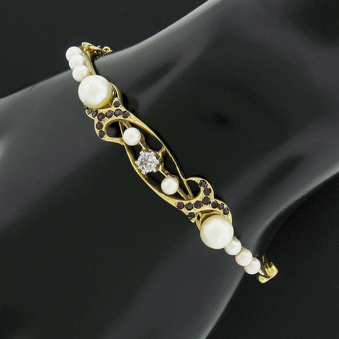 A solid 14k yellow gold hinged bangle bracelet, with 1 old transitional cut natural diamond (G - SI2 ; 0.22ctw), 20 round cut natural garnets (0.30ctw), and 10 round shape cultured pearls (6.4 to 3.5mm each). It weighs a total of 12.26 grams, measures 8.6