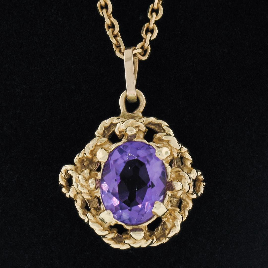 Vintage 14K Yellow Gold 1.75 ctw Oval Amethyst w/ Open Twisted Wire Frame Pendan