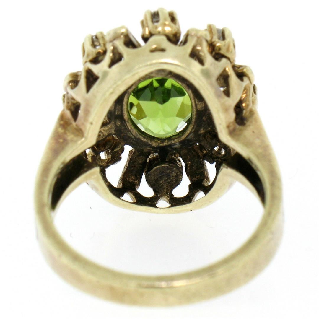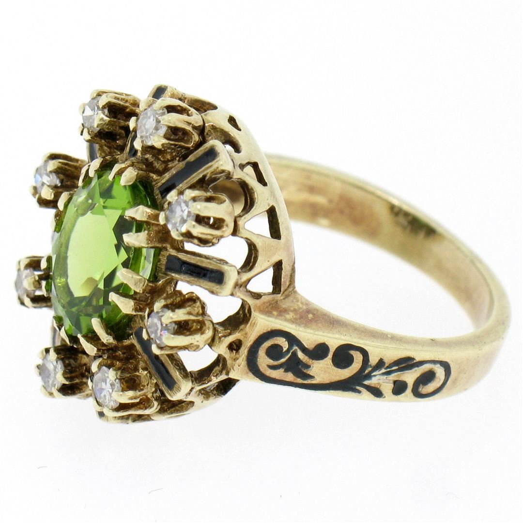 A vintage solid 14k yellow gold ring multi-prong set with a natural, oval cut, rich green peridot (2.08ct) surrounded by a halo of 8 very fine quality round brilliant diamonds (F/G - VS1/VS2; 0.35ctw) and accented with black enamel. The ring is size 6, weighs a total of 7.39 grams, and measures 17.73mm wide.
