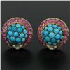 A pair of vintage 14k yellow gold cluster earrings featuring 38 cabochon cut natural turquoise stones (3.0 to 4.0mm) set in sterling silver prongs with 32 cabochon cut natural rubies (3.20ctw) surrounding them and round brilliant cut natural diamond trios (G/H - VS1/VS2; 0.36ctw) accenting the bottom of each earring. The earrings have clip-on omega backings, measure approximately 22.0mm in diameter, and weigh a total of 25.37 grams.