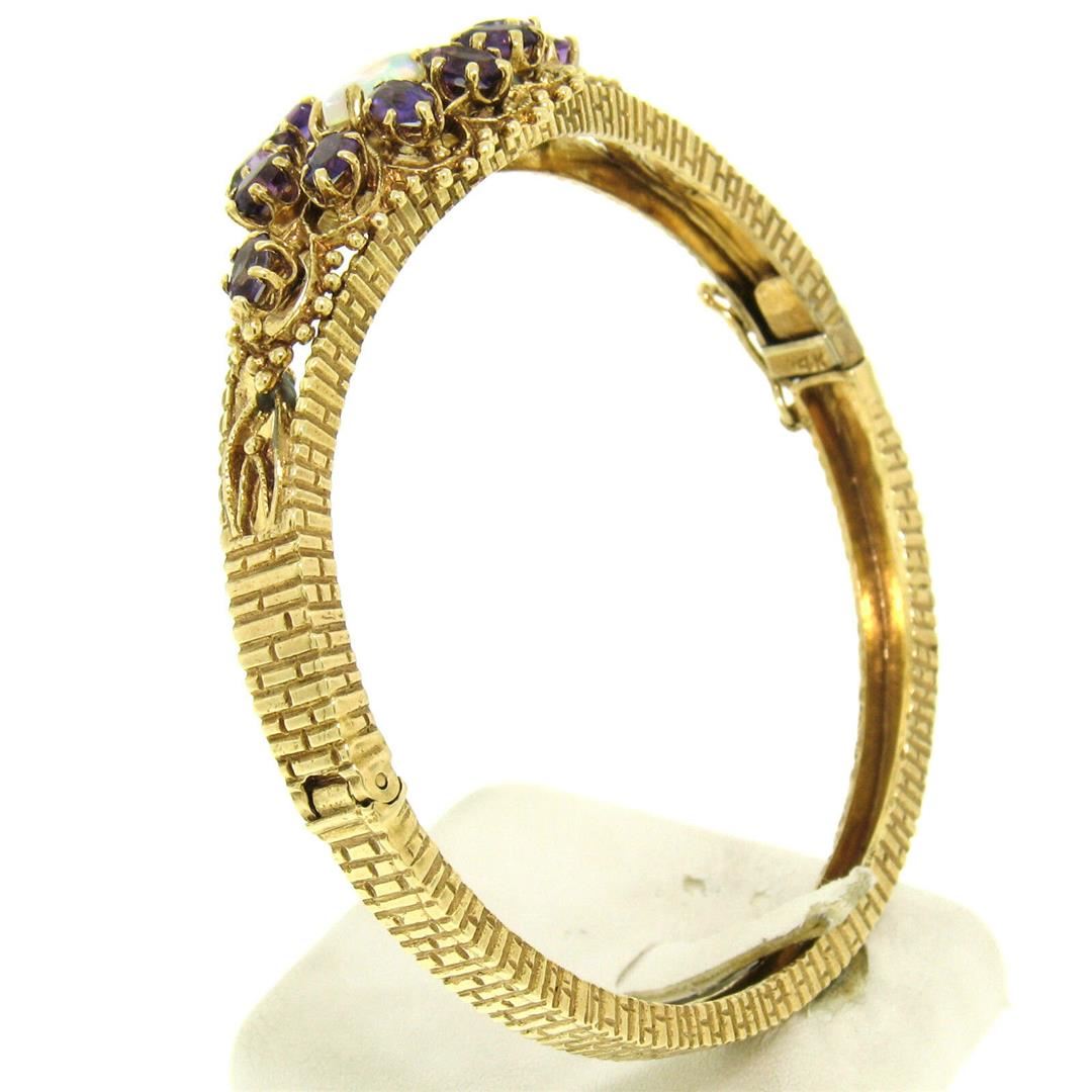 One Vintage 14K Yellow Gold 3.75ct Amethyst & Opal Filigree Textured Bangle Bracelet. Item Details: Material: 14K Solid Yellow Gold, Weight: 18.8 Grams, Stone(s): (12) Natural Genuine Amethyst - Oval Cut - Prong Set - Royal Purple Color - 3.00ctw (approx.), (1) Natural Genuine Opal - Marquise Cabochon Cut - Prong Set - White Base Color w/ Beautiful Green and Blue Play - 0.75ctw (approx), Total Carat Weight: 3.75ctw (approx.), Clasp: Box type clasp w/ safety latch, Size: Fits up to 6.5 inch wrist, Width: 20.4mm Height: 8.45mm rise off the wrist Condition: Vintage piece. Excellent condition w/ amazing patina!