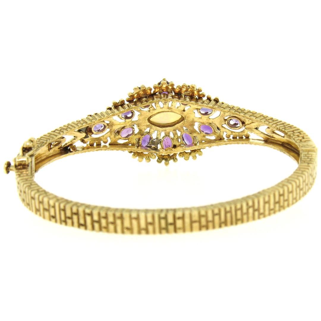 A vintage solid 14k yellow gold bangle bracelet, featuring 1 marquise cabochon cut natural opal (0.75ctw), with a halo of 12 oval cut natural amethyst (3.00ctw ). It weighs a total of 18.8 grams, measures 20.4mm wide, and measures 6.5 inches in length.