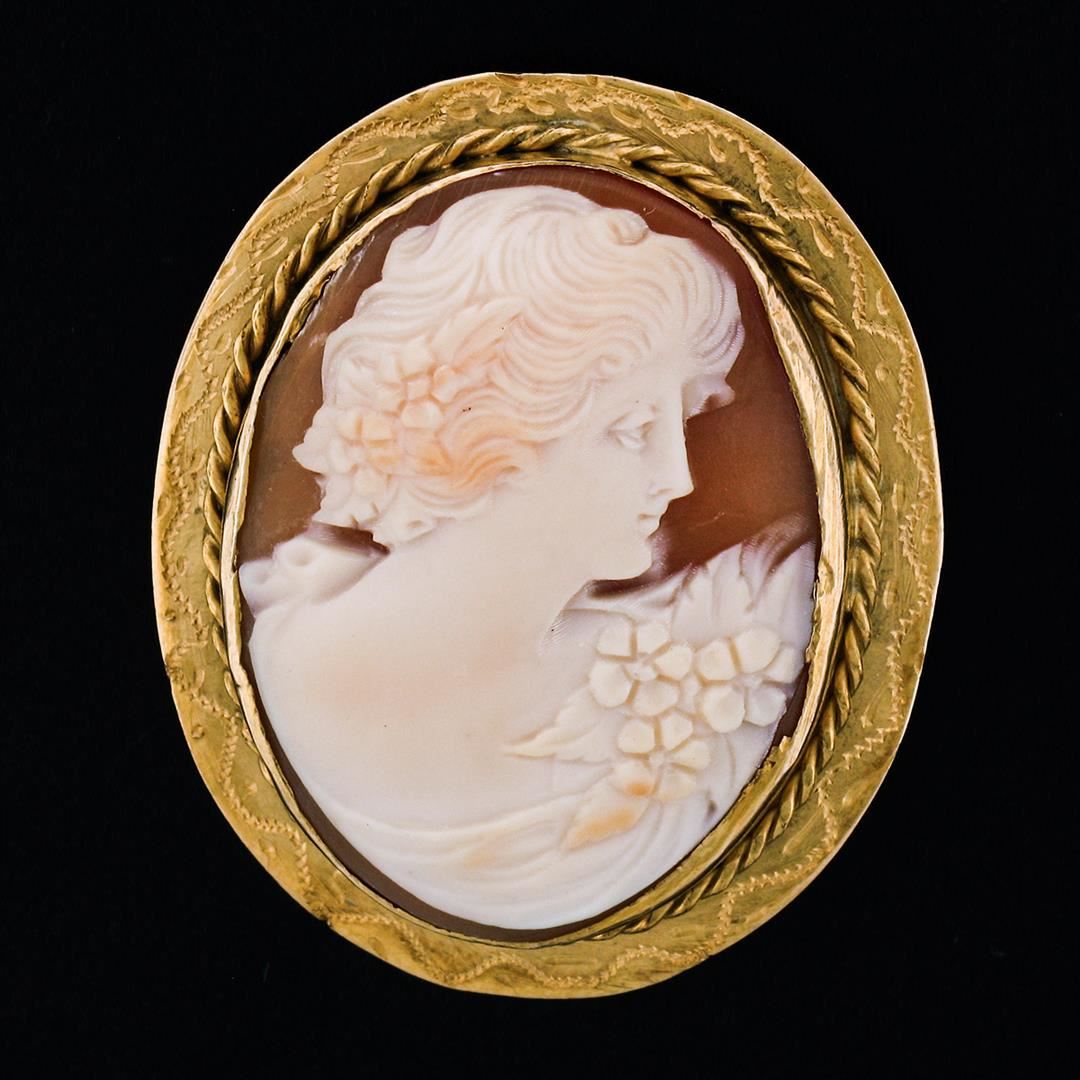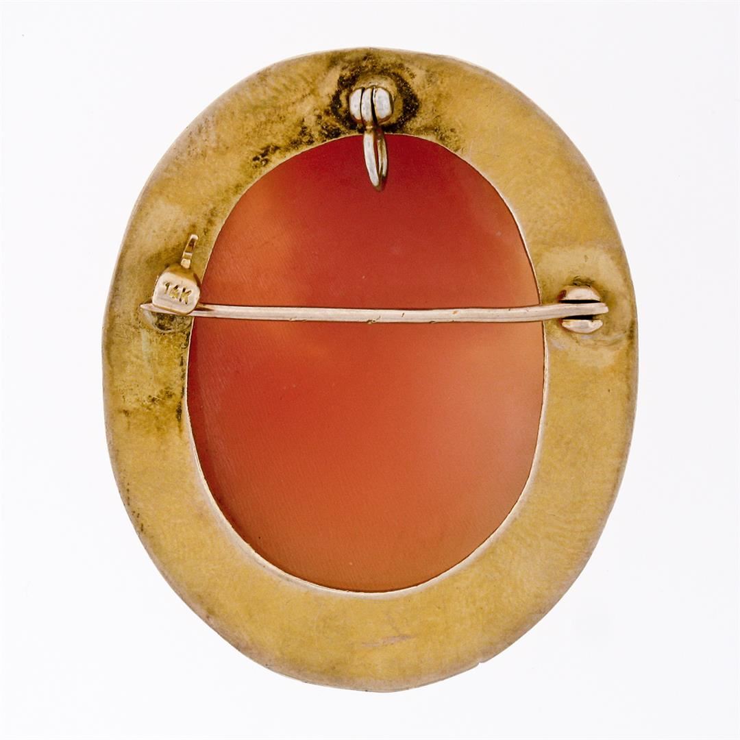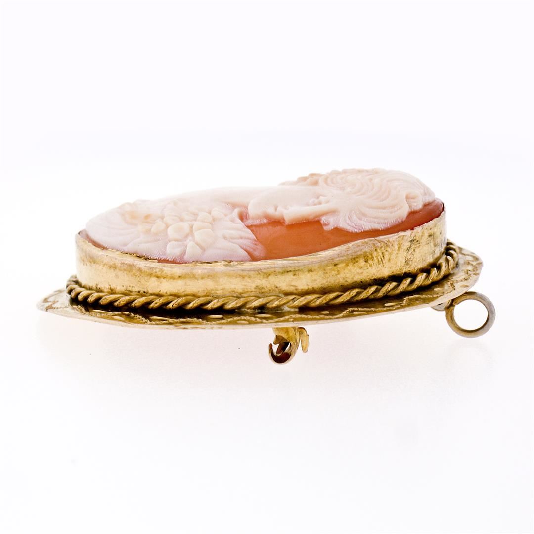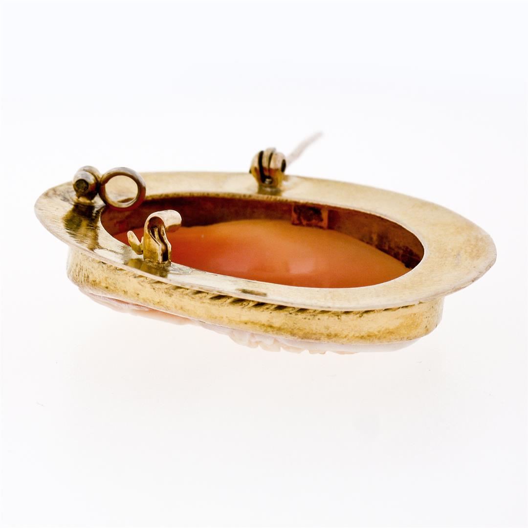 A vintage solid 14k yellow gold brooch pendant, with 1 oval shape carved shell cameo (30.30x22.30mm). Measures 38.20x30.50mm and weighs a total of 8.73 grams.