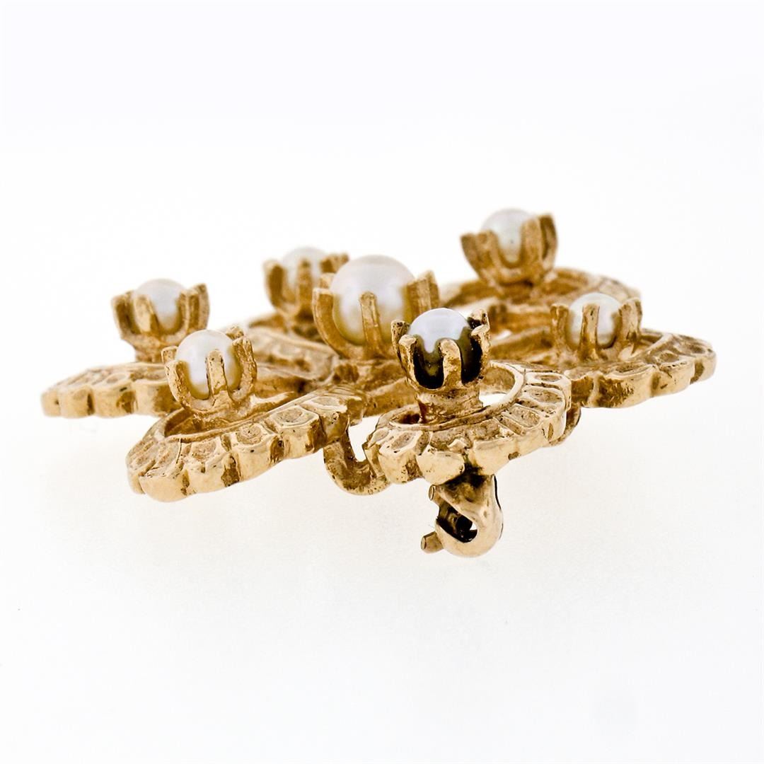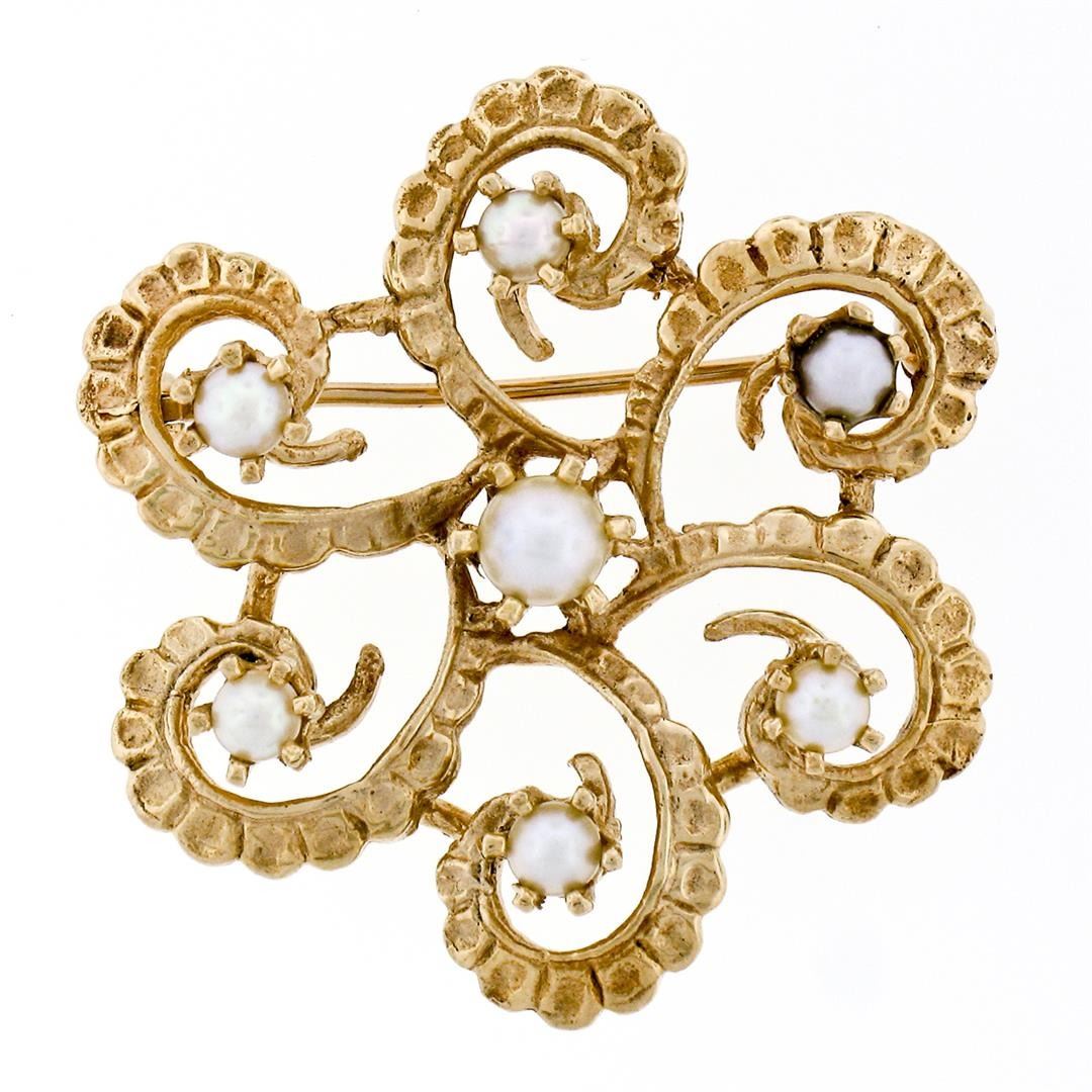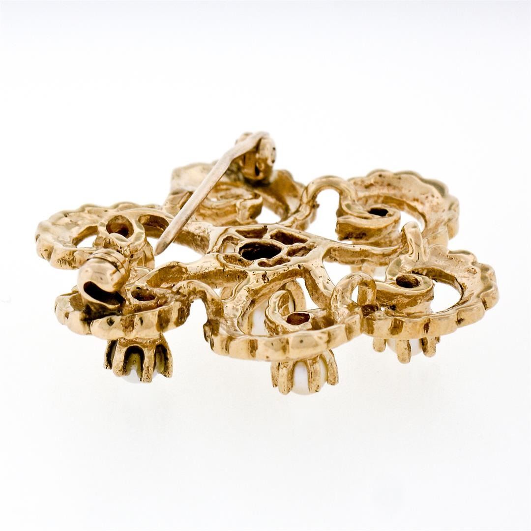 Vintage 14K Yellow Gold Cultured Pearl Detailed Textured Open Work Brooch Pin