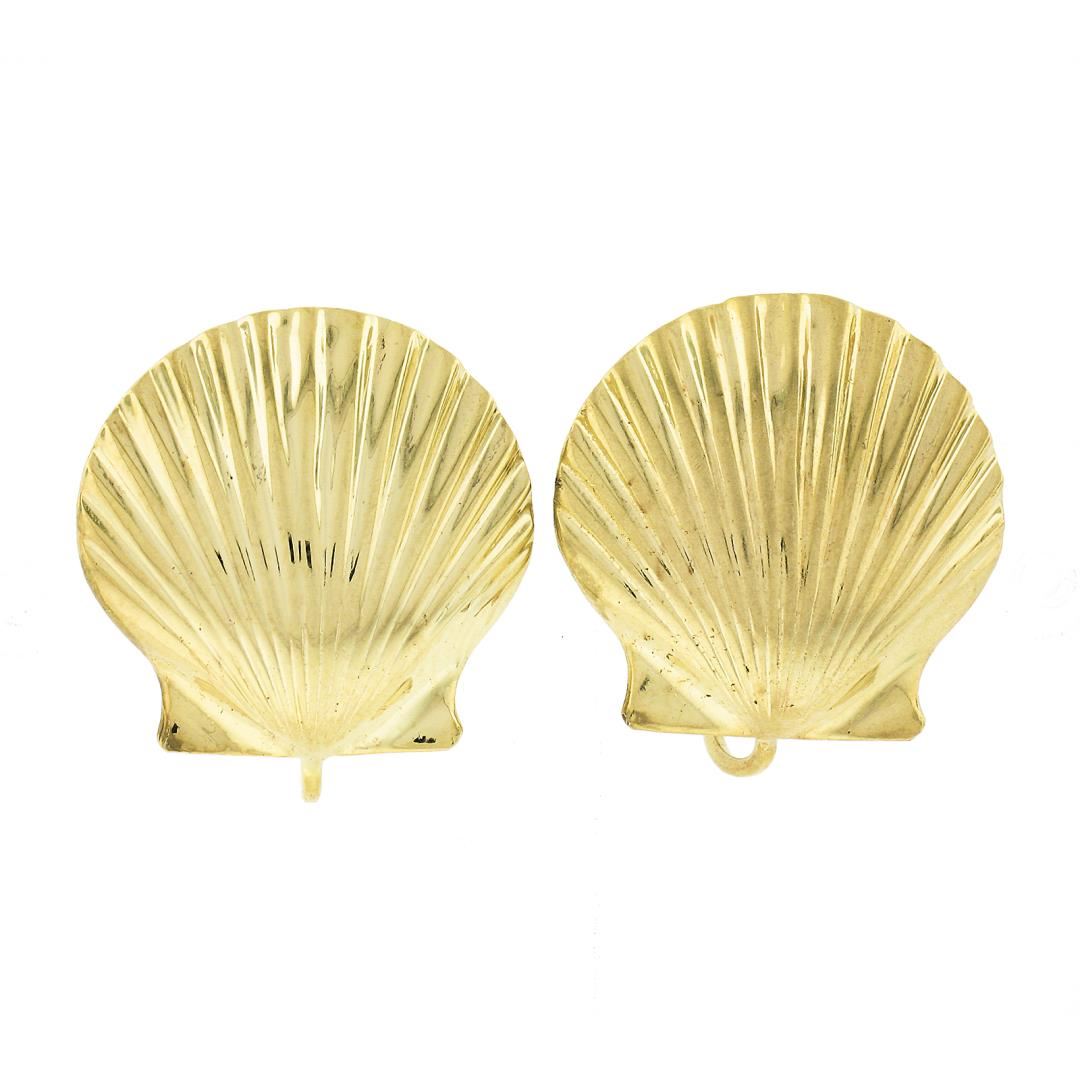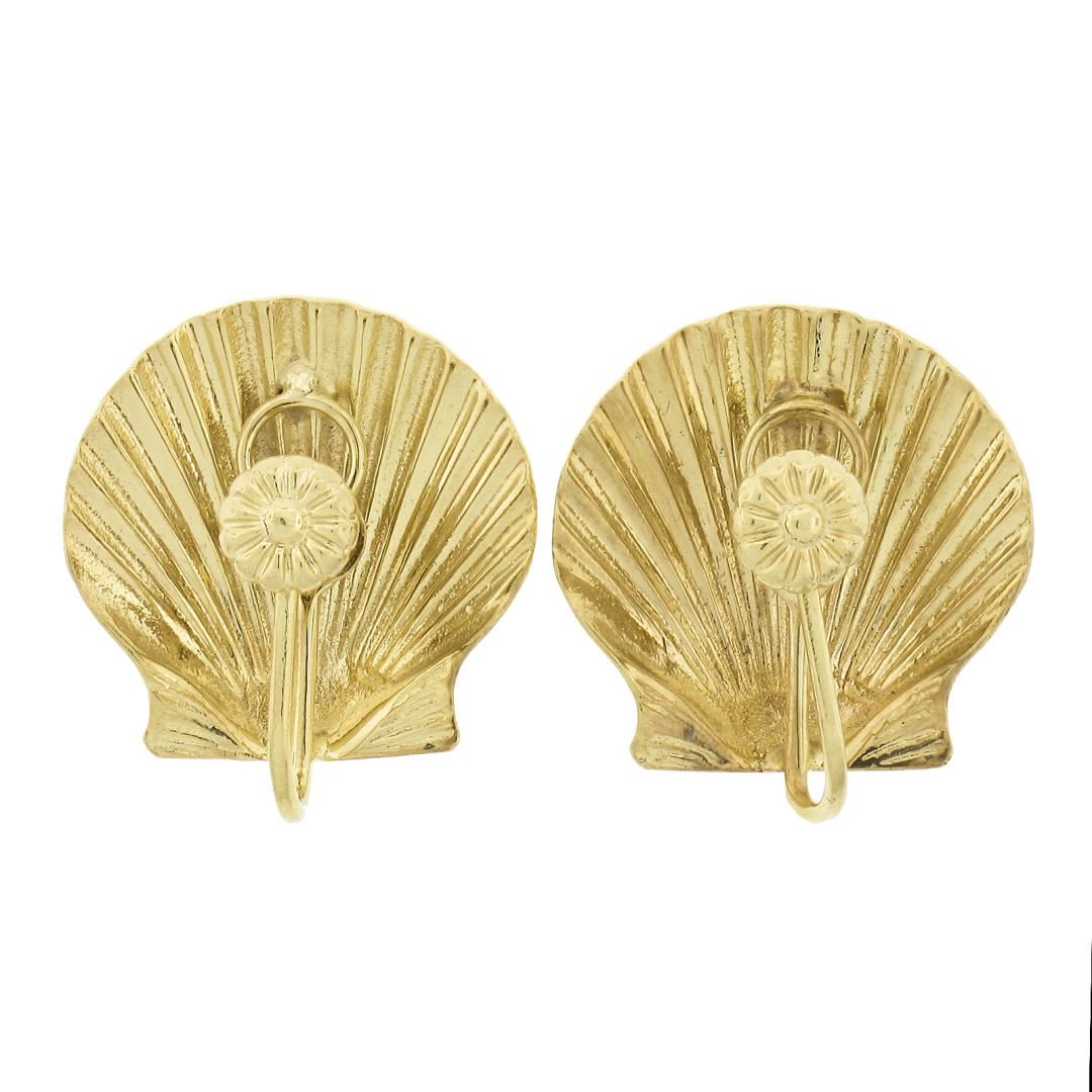 A vintage solid 14k yellow gold shell earrings. The earrings measure approximately 18.9x19.3mm and weigh a total of 5.58 grams.