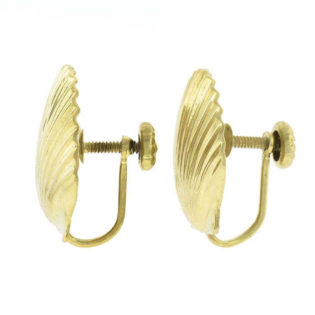 A vintage solid 14k yellow gold shell earrings. The earrings measure approximately 18.9x19.3mm and weigh a total of 5.58 grams.