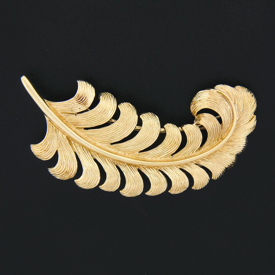 A vintage solid 14k yellow gold feather brooch. Measures 27.1x58mm and weighs a total of 16.75 grams.