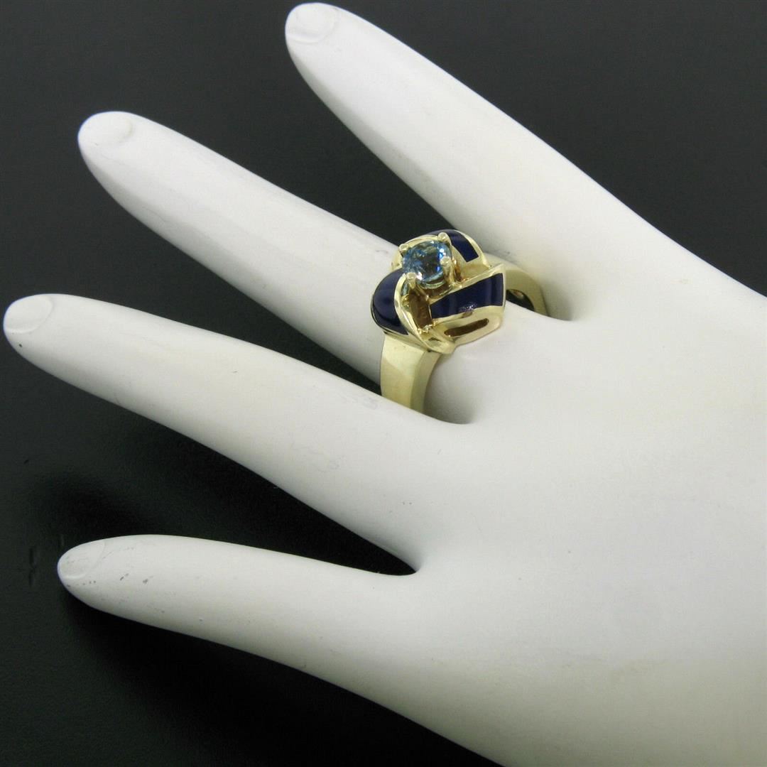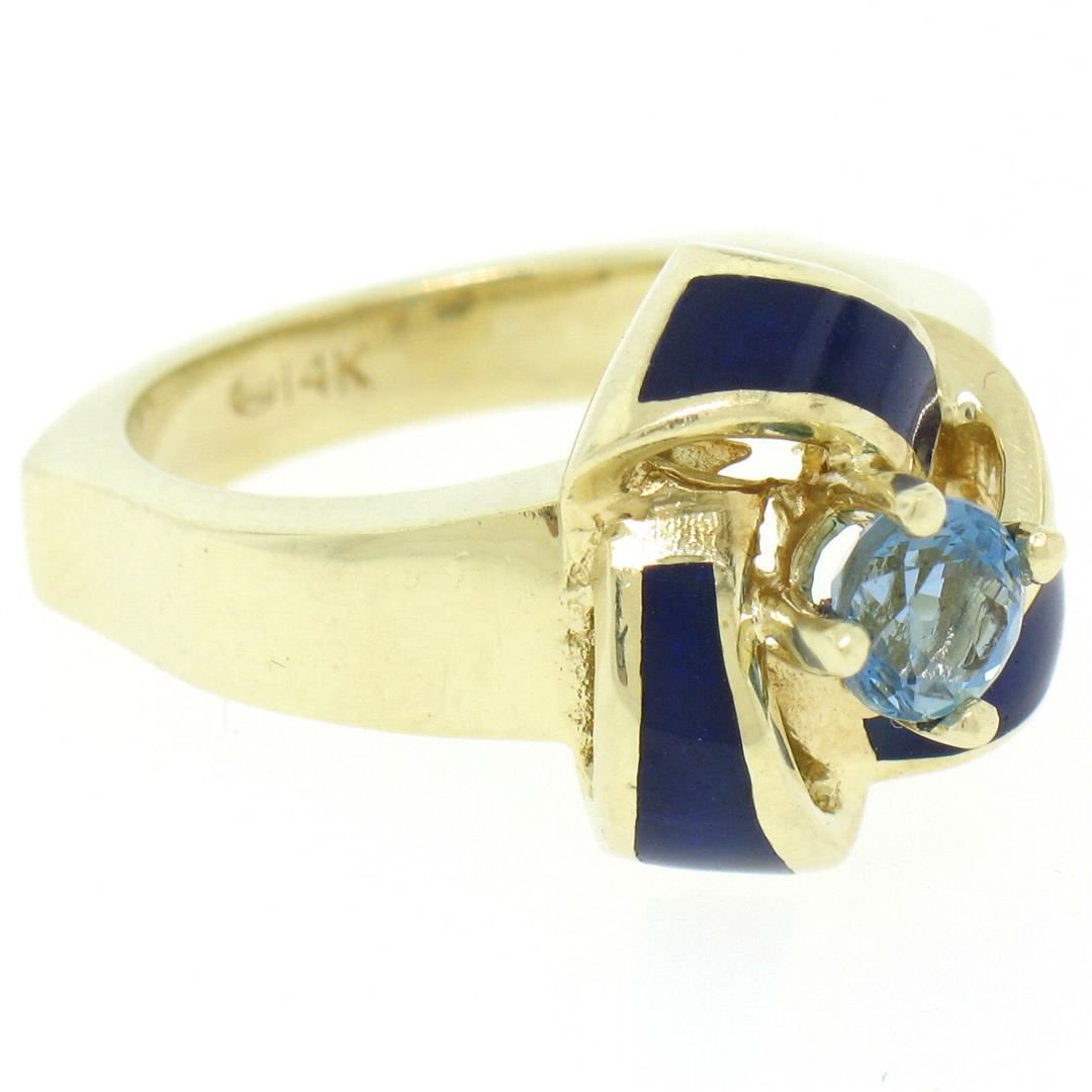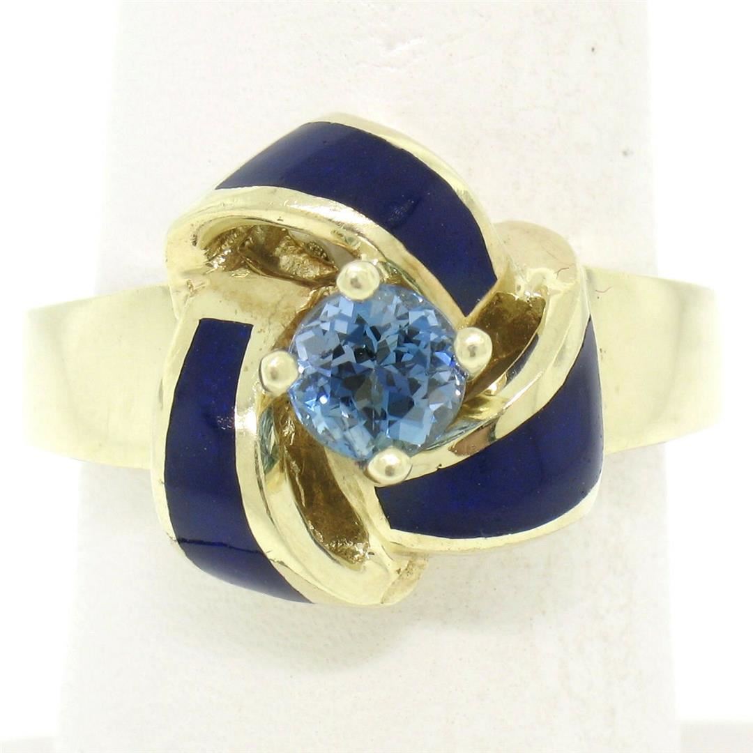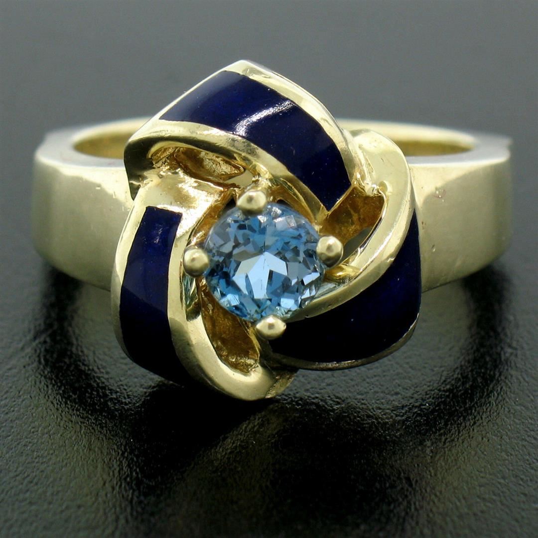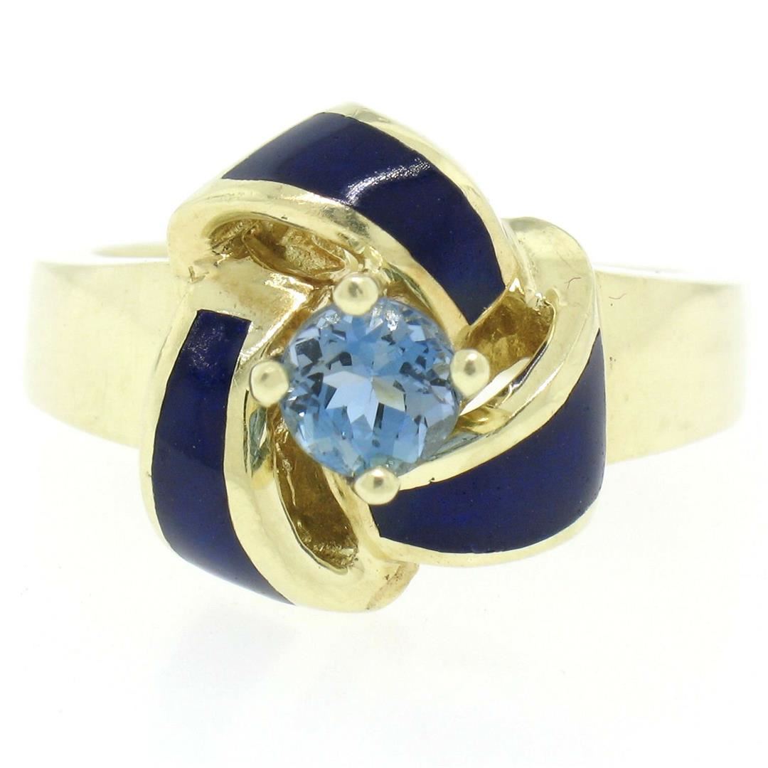 A vintage solid 14k yellow gold knot ring prong set with a natural, round cut, rich blue aquamarine (0.56ct) accented by royal blue enamel. The ring is size 8.0, weighs a total of 10.28 grams, and measures 14.75mm wide.