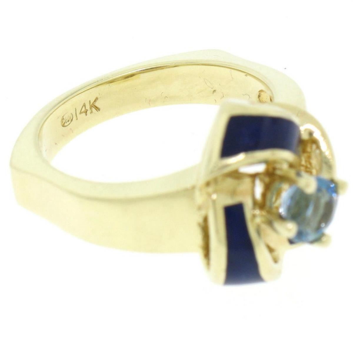 A vintage solid 14k yellow gold knot ring prong set with a natural, round cut, rich blue aquamarine (0.56ct) accented by royal blue enamel. The ring is size 8.0, weighs a total of 10.28 grams, and measures 14.75mm wide.