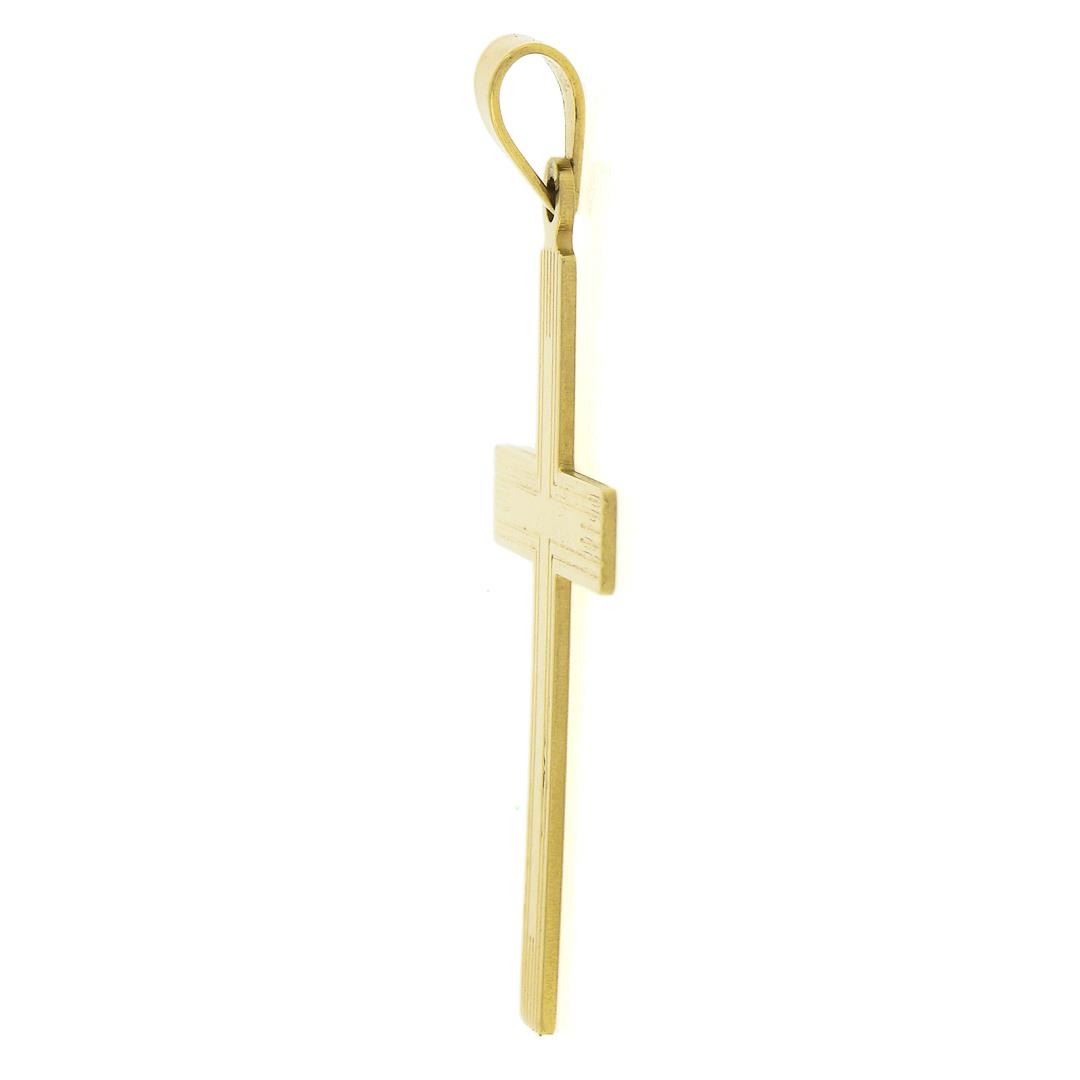 A vintage solid 14k yellow gold cross pendant. The pendant weighs a total of 1.41 grams, measures 34.9x17.9mm including the bail, and the inside of the bail measures 4.2x2.6mm.