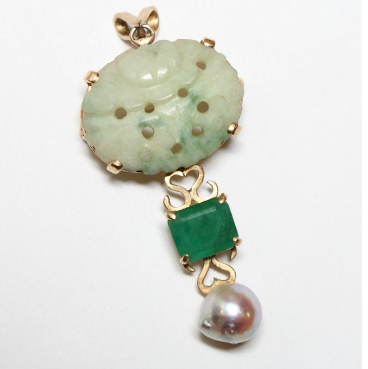 Vintage 14K Yellow Gold Jade, Emerald, Pearl Pendant. Pendant measures 1 3/4" in length by 3/4" in width. Total weight of 5.98 grams.