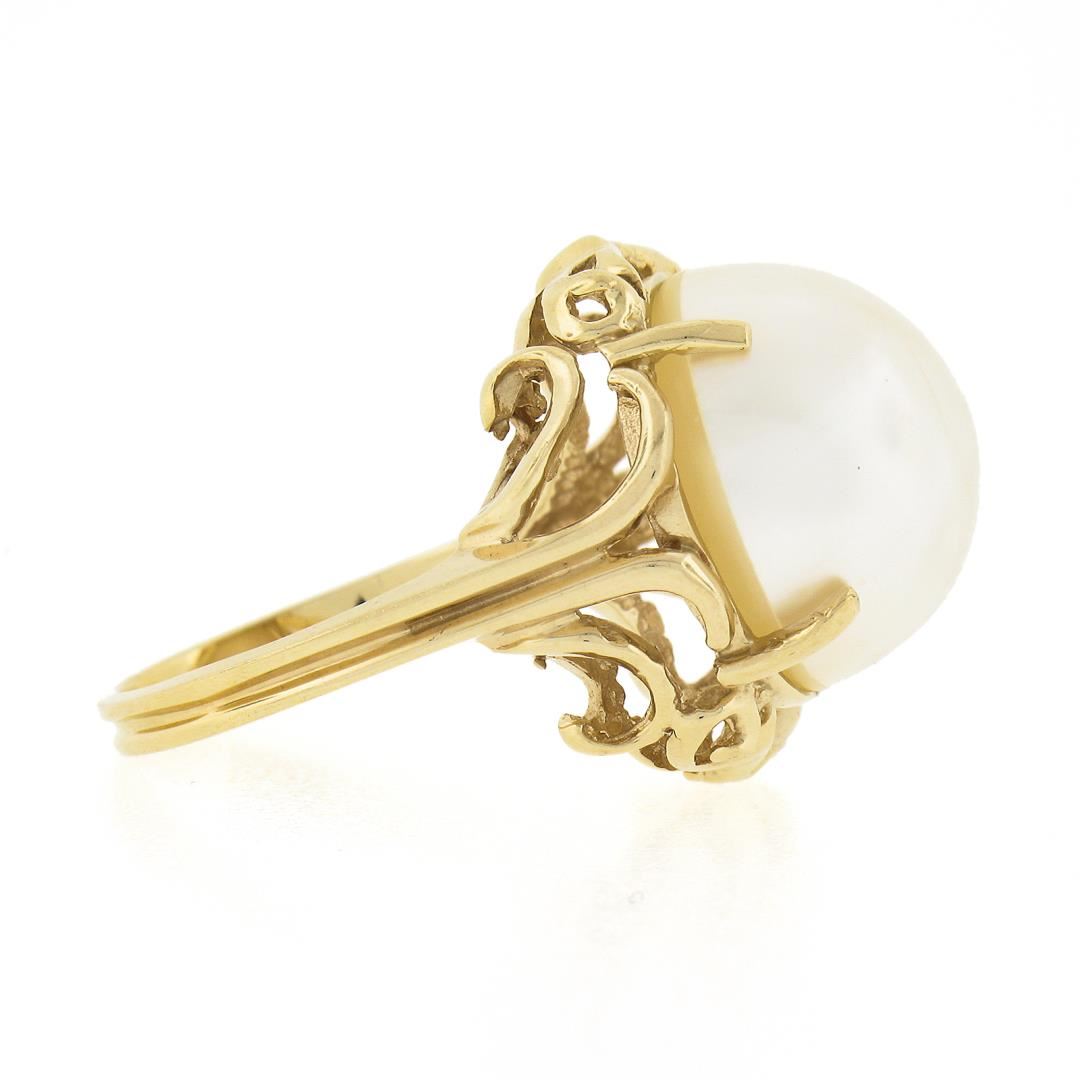 A vintage solid 14k yellow gold ring, with 1 round shape cultured mabe pearl (14.8mm). The ring is size 6.5, weighs a total of 7.01 grams, and measures 18.8mm wide.