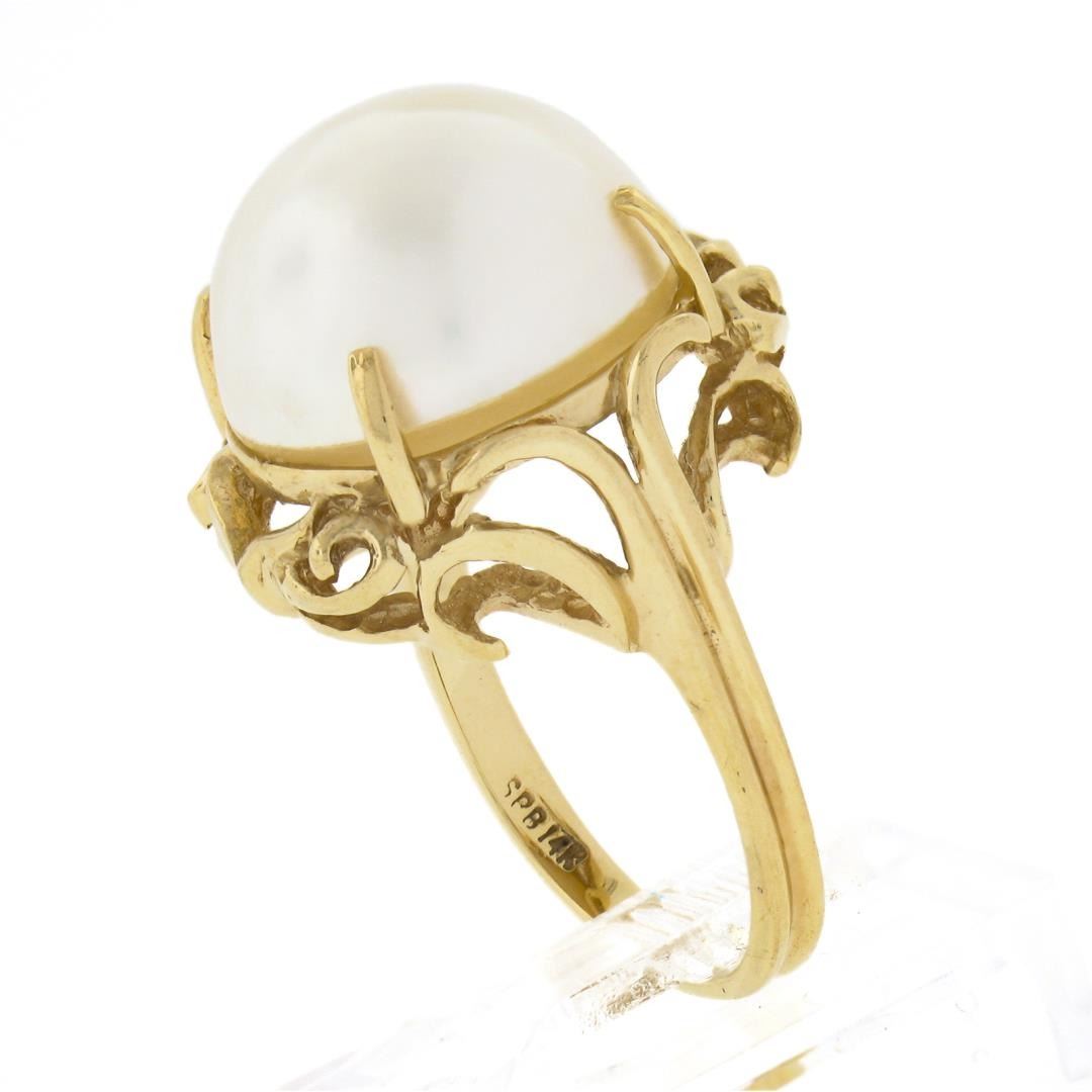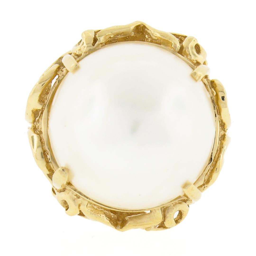 Vintage 14K Yellow Gold Large 14.8mm Mabe Pearl Open Work w/ Grooved Band Ring