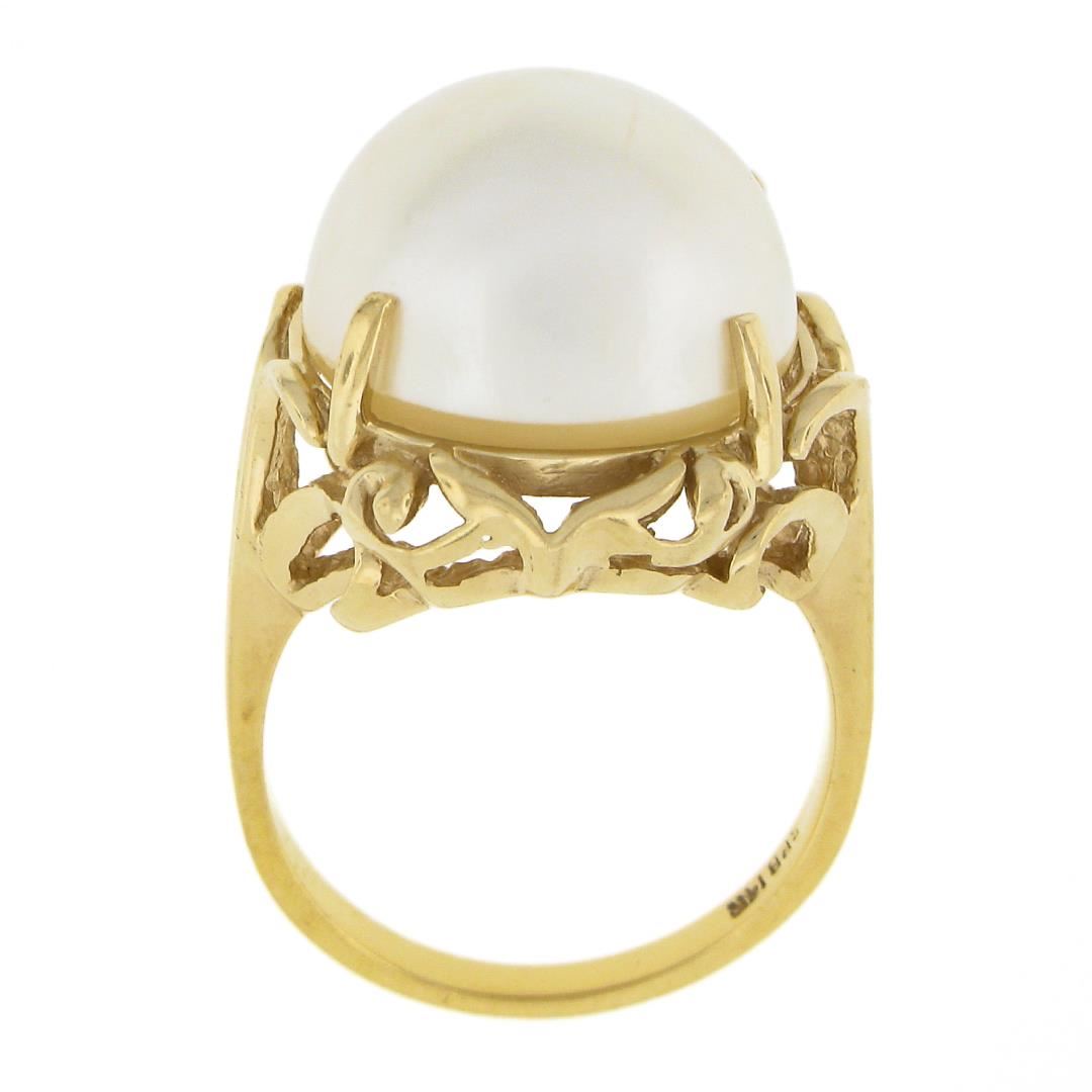A vintage solid 14k yellow gold ring, with 1 round shape cultured mabe pearl (14.8mm). The ring is size 6.5, weighs a total of 7.01 grams, and measures 18.8mm wide.