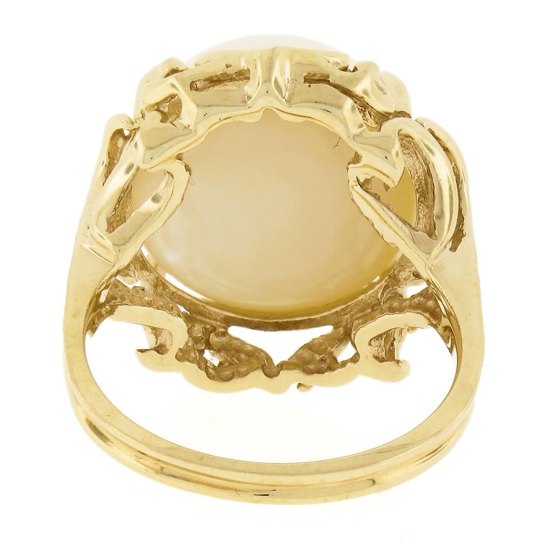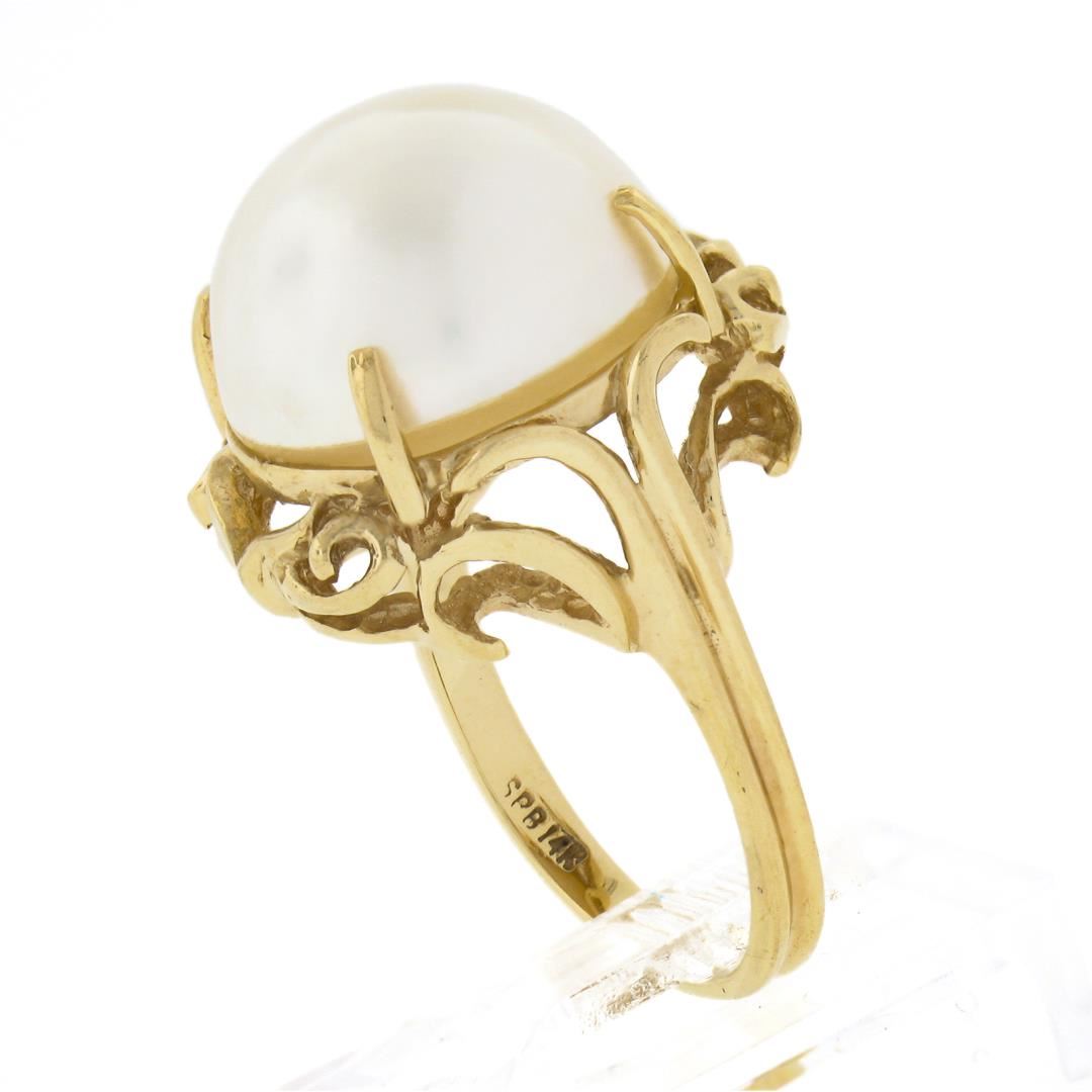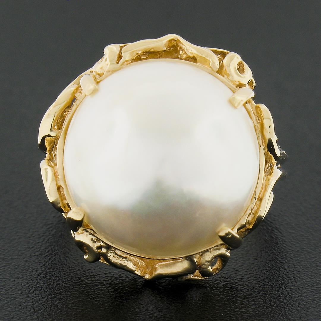 A vintage solid 14k yellow gold ring, with 1 round shape cultured mabe pearl (14.8mm). The ring is size 6.5, weighs a total of 7.01 grams, and measures 18.8mm wide.