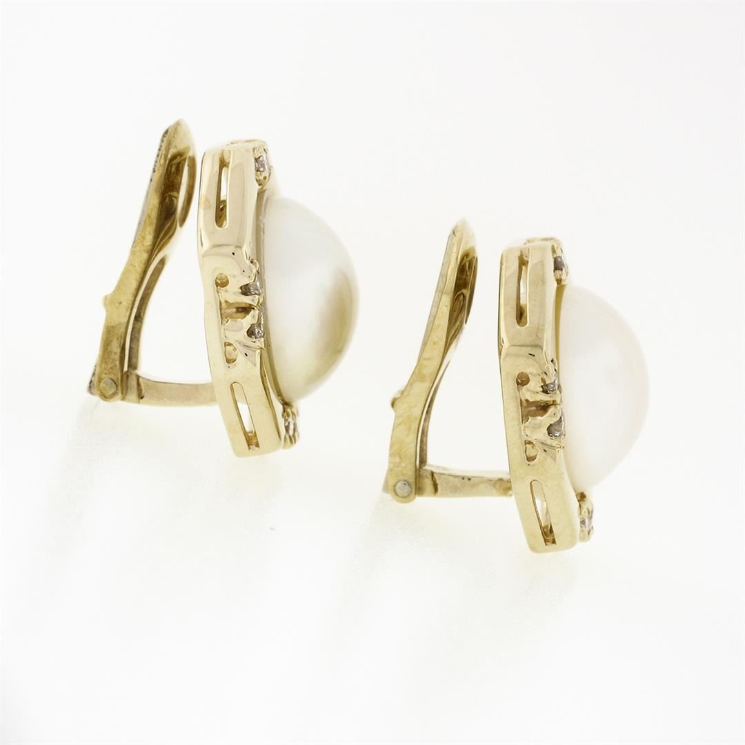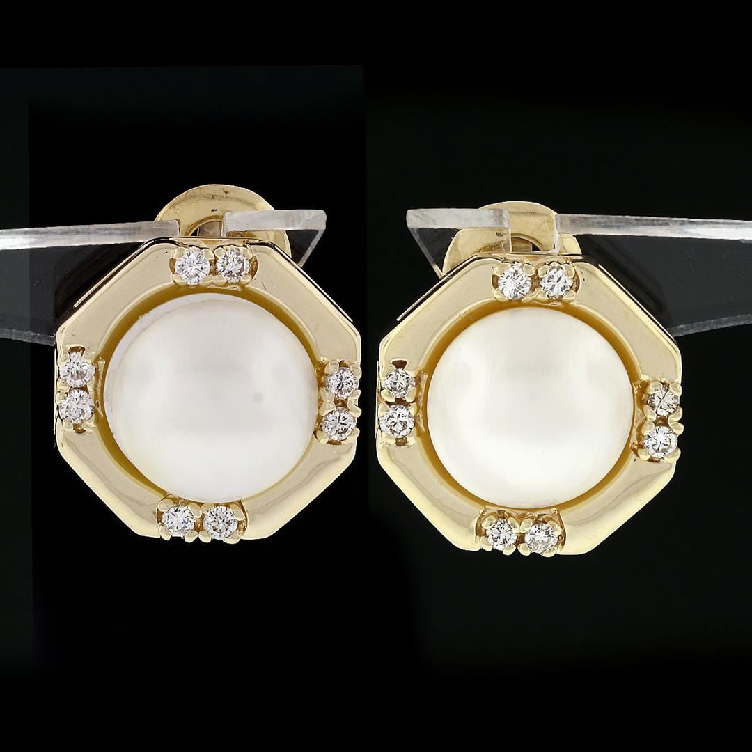 A solid 14k yellow gold clip on earrings, featuring 2 round shape mabe pearls (11.9mm), & 16 round brilliant cut natural diamonds (H/I - VS1/VS2 ; 0.50ctw). The earrings measure approximately 17.6mm octagon frame dimension and weigh a total of 13.08 grams.
