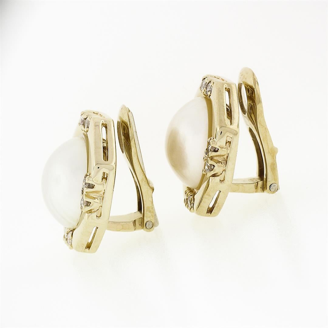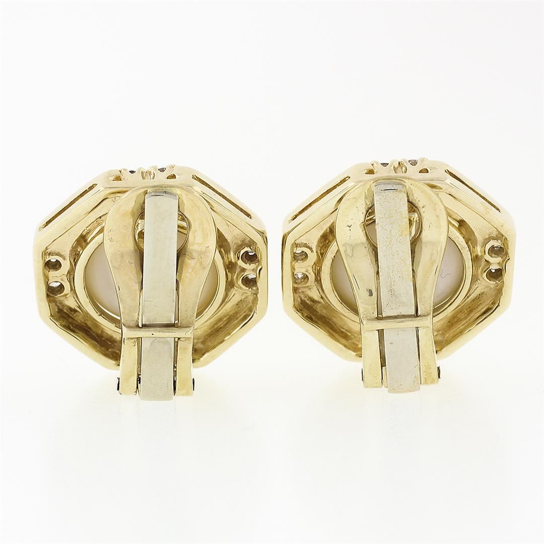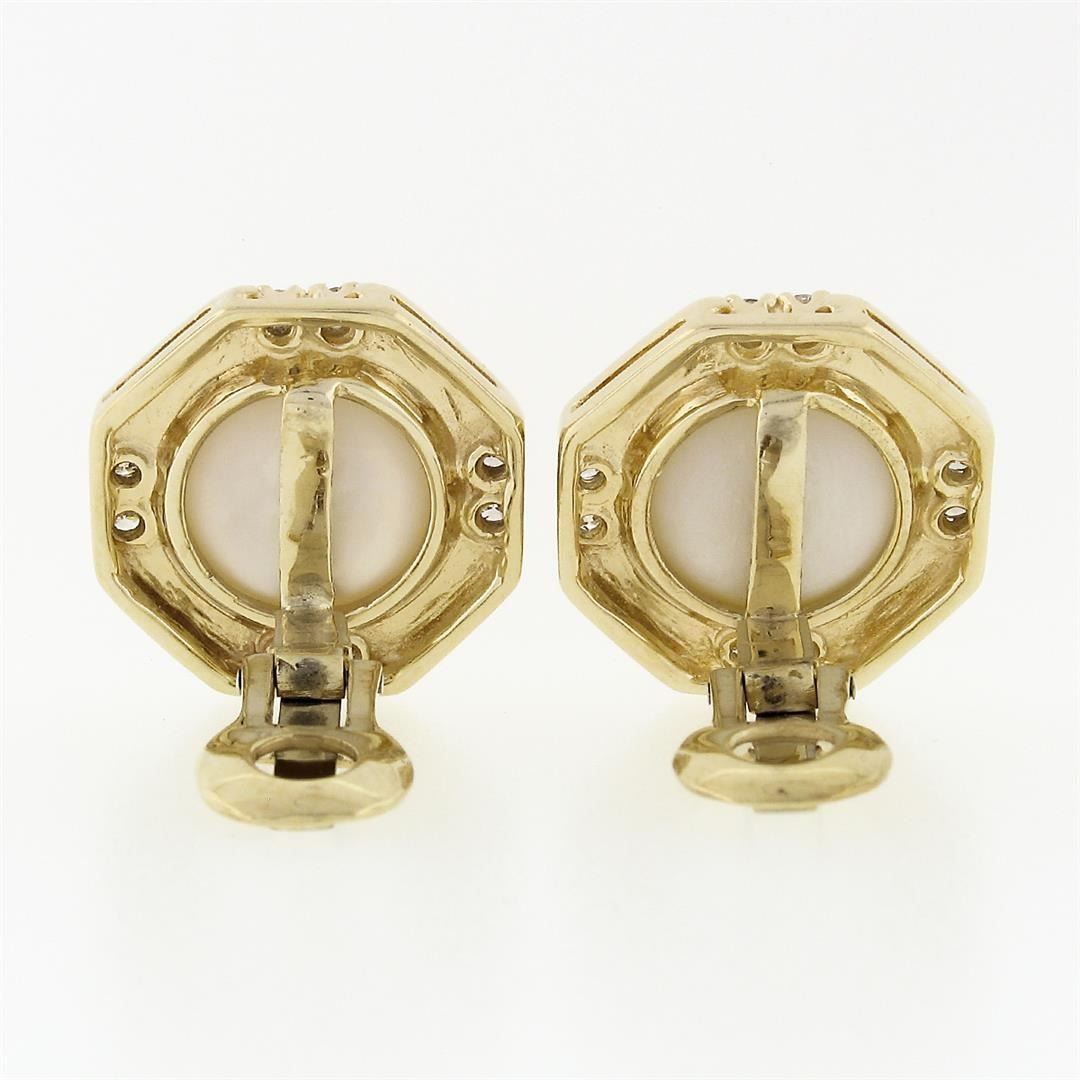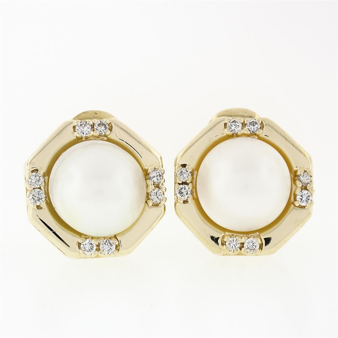 A solid 14k yellow gold clip on earrings, featuring 2 round shape mabe pearls (11.9mm), & 16 round brilliant cut natural diamonds (H/I - VS1/VS2 ; 0.50ctw). The earrings measure approximately 17.6mm octagon frame dimension and weigh a total of 13.08 grams.