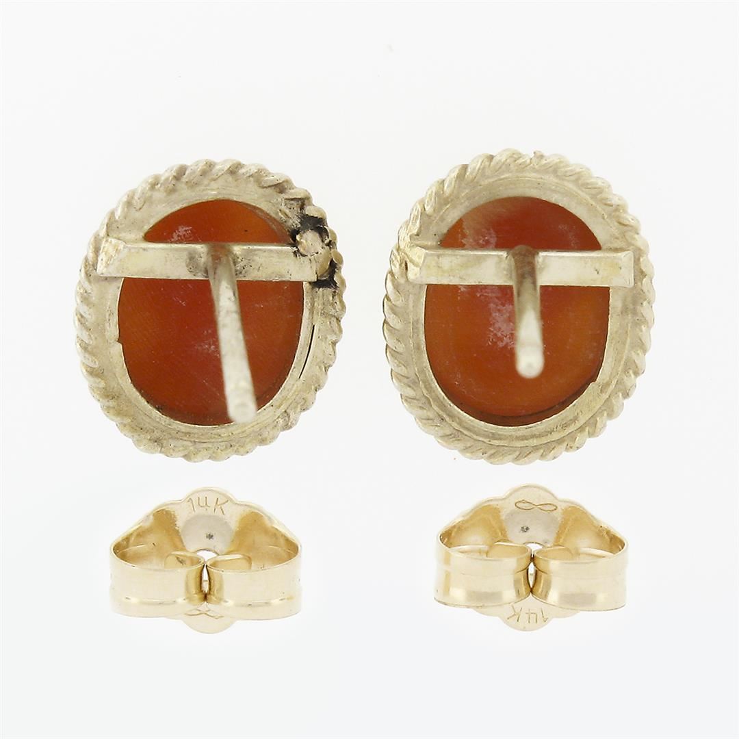 A vintage solid 14k yellow gold stud earrings, with 2 oval shape carved cameo shell (6.0x7.95mm). The earrings measure approximately 10x8.3mm and weigh a total of 1.44 grams.