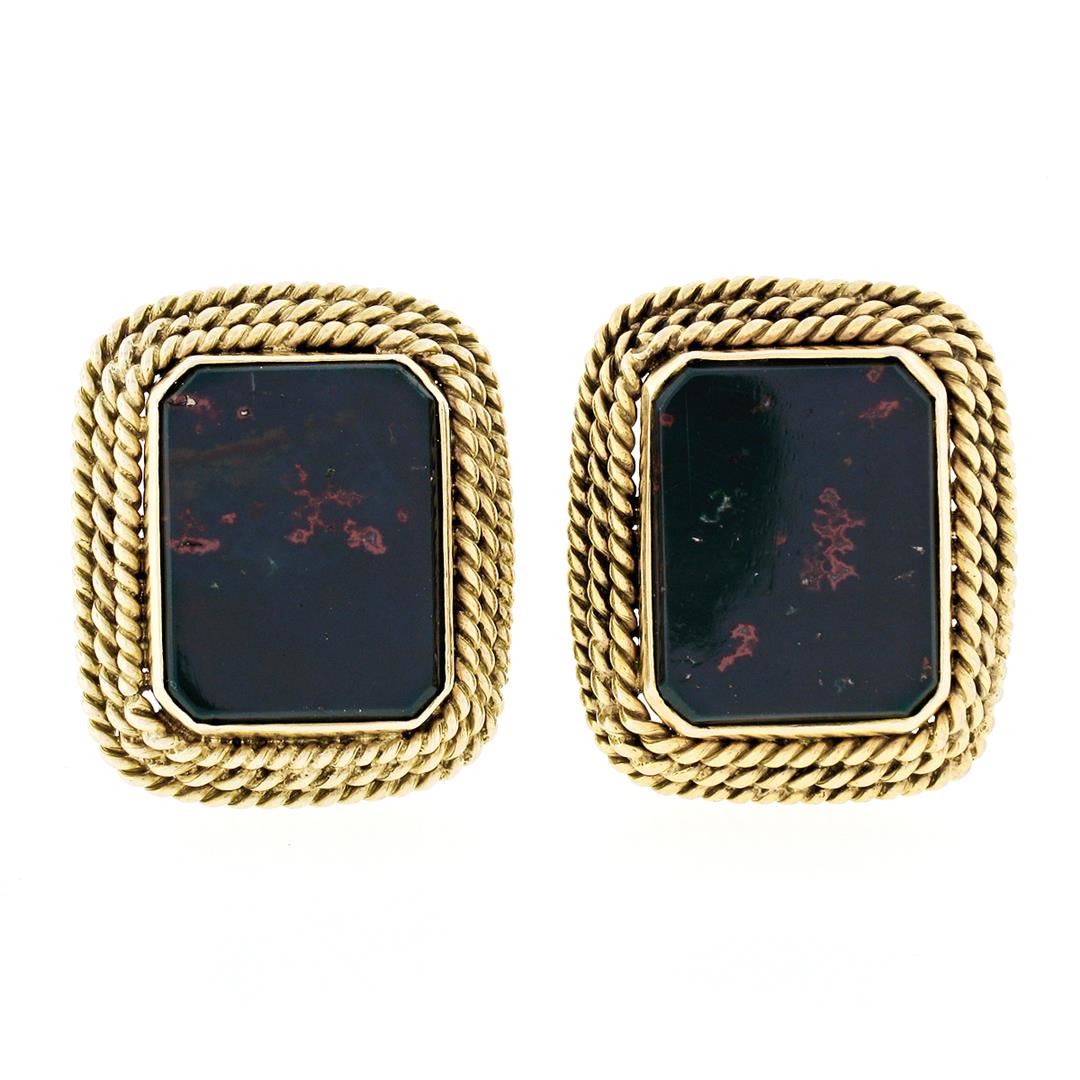 A vintage solid 14k yellow gold button earrings, featuring 2 octagonal cut natural bloodstones (14.1x10.9mm). The earrings measure approximately 21.35x17.9mm and weigh a total of 10.45 grams.