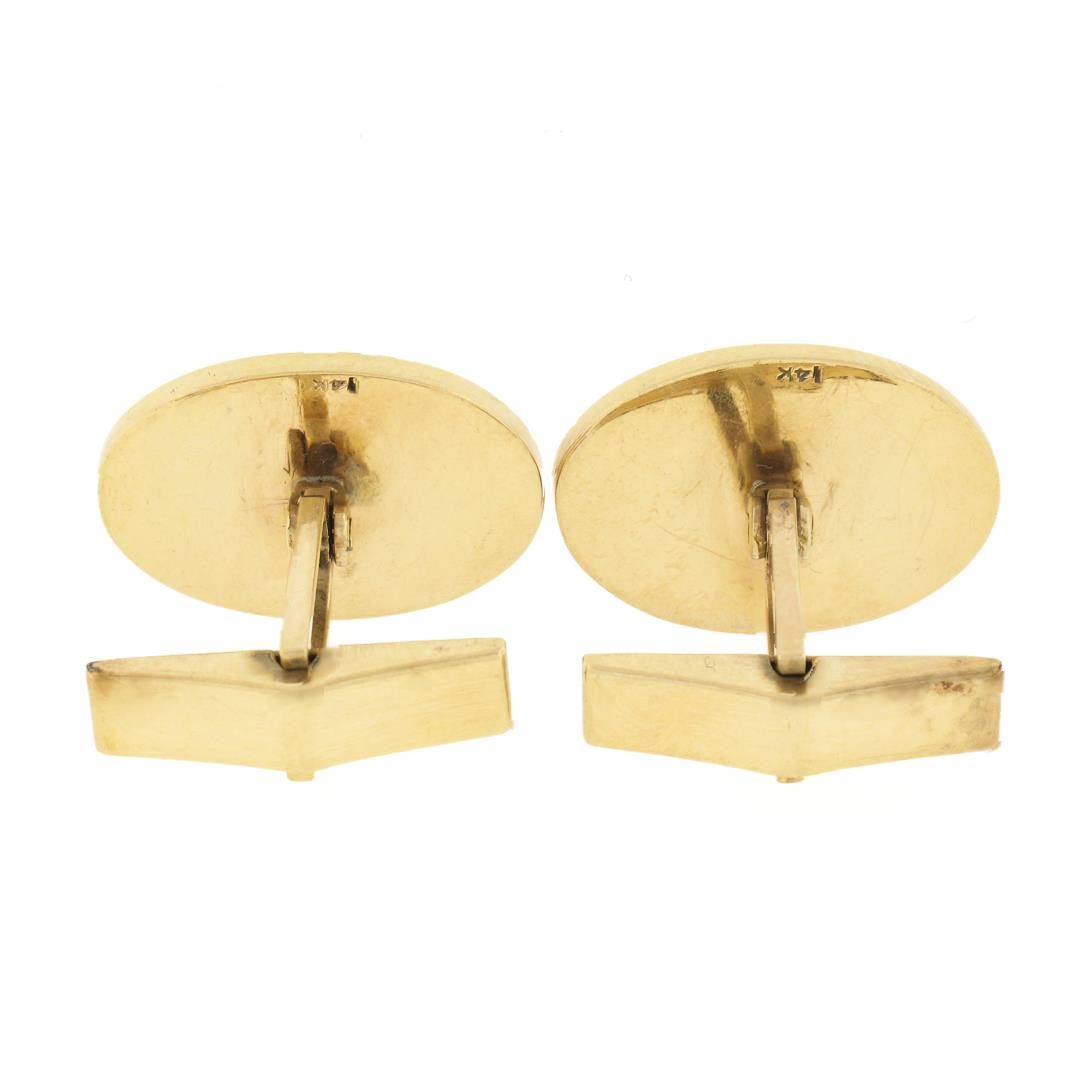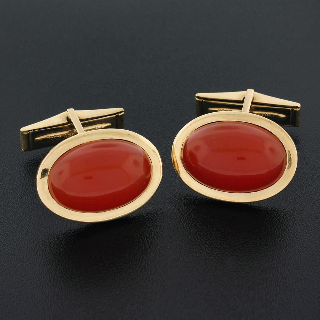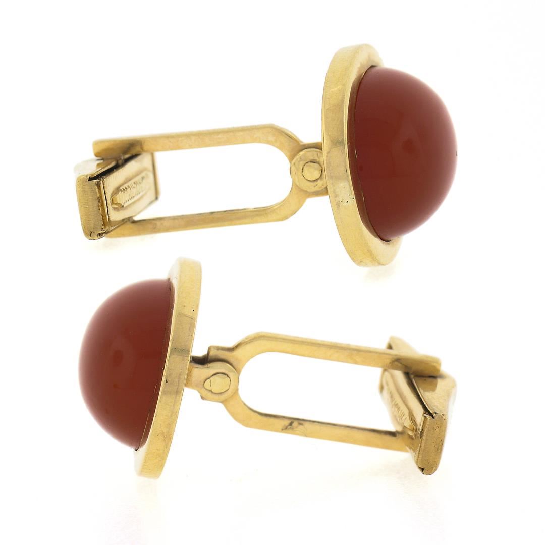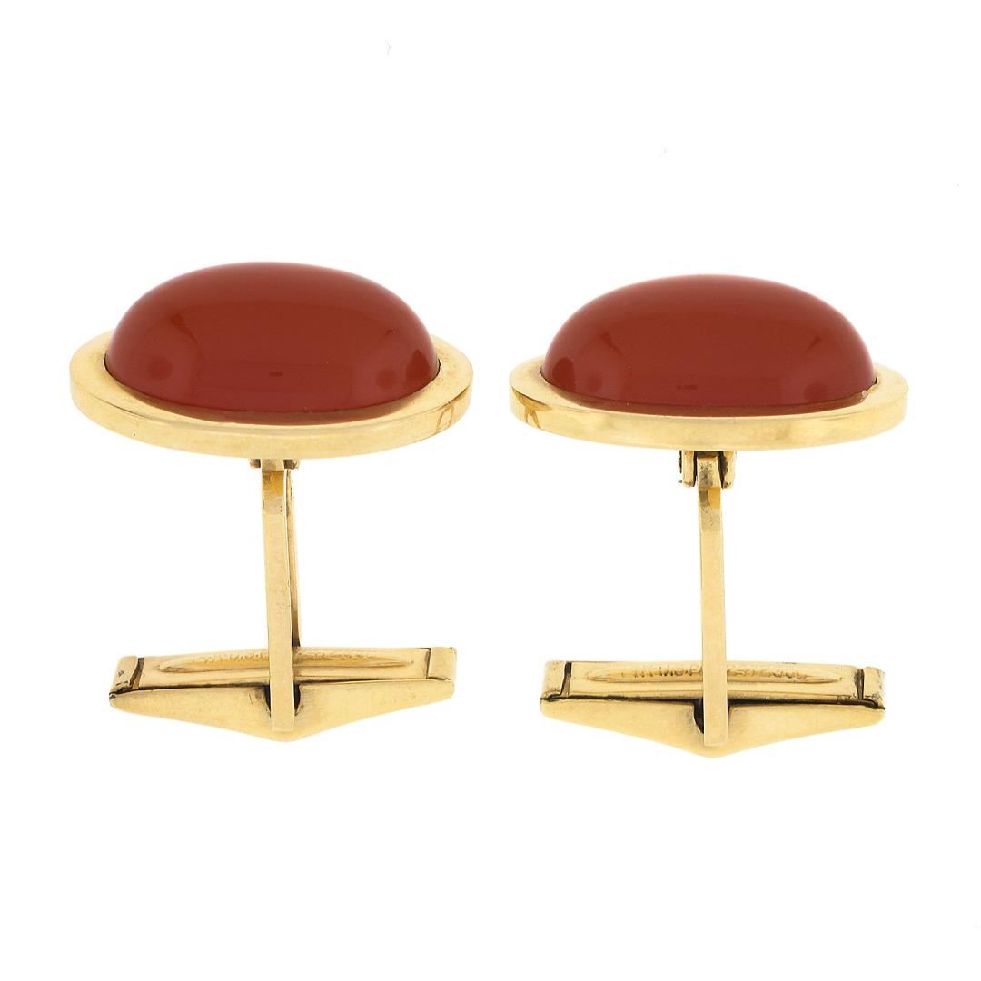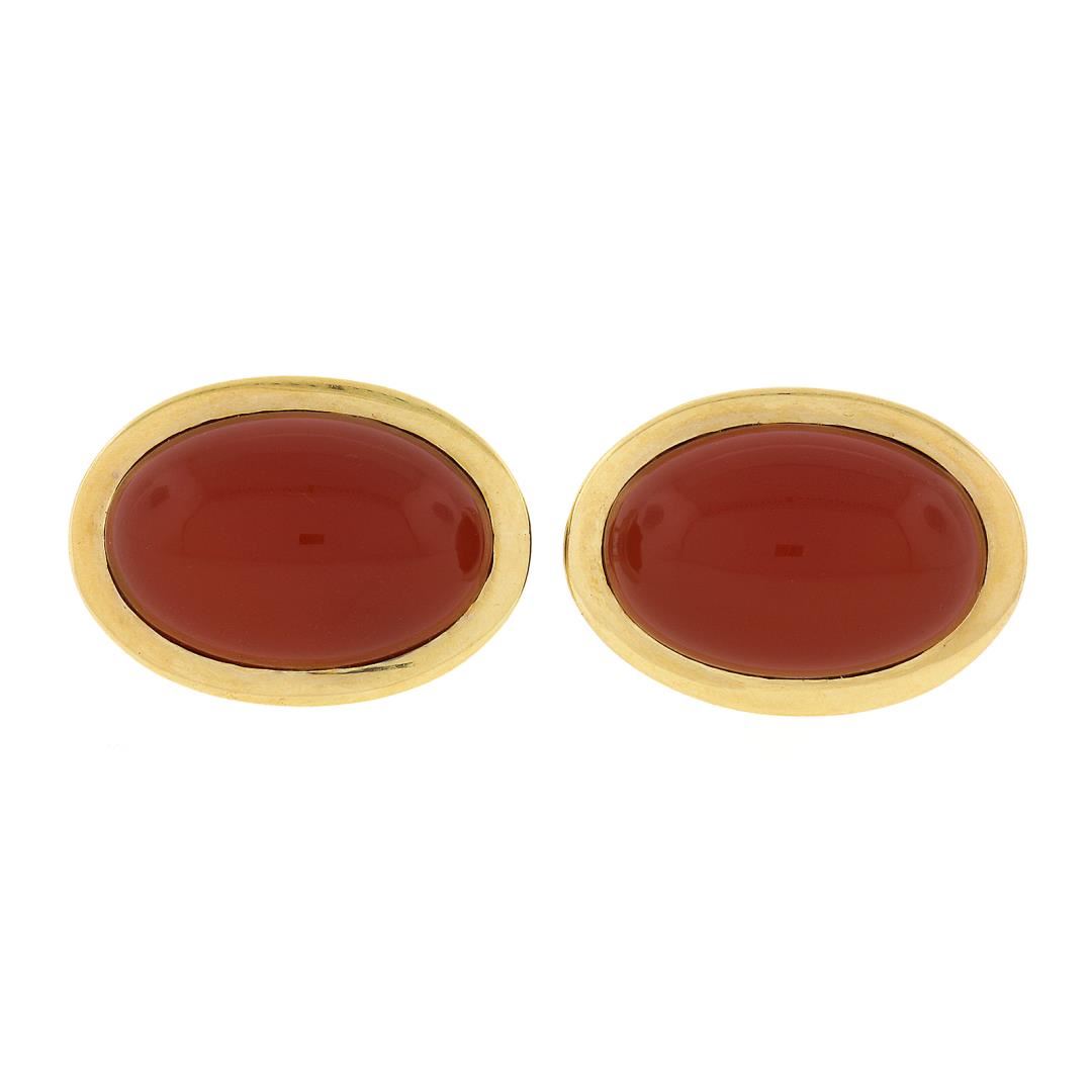 A vintage solid 14k yellow gold cufflinks, with 2 oval cabochon cut natural carnelians (18.5x12.1mm). These cuff links have a swivel design with a clearance of 15.8mm, weigh a total of 15.69 grams, and the front panels measure 21.85x15.65mm.