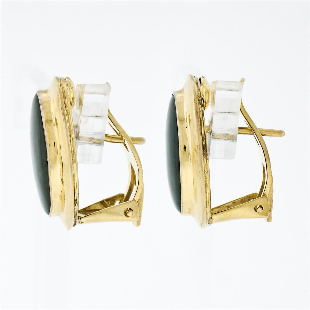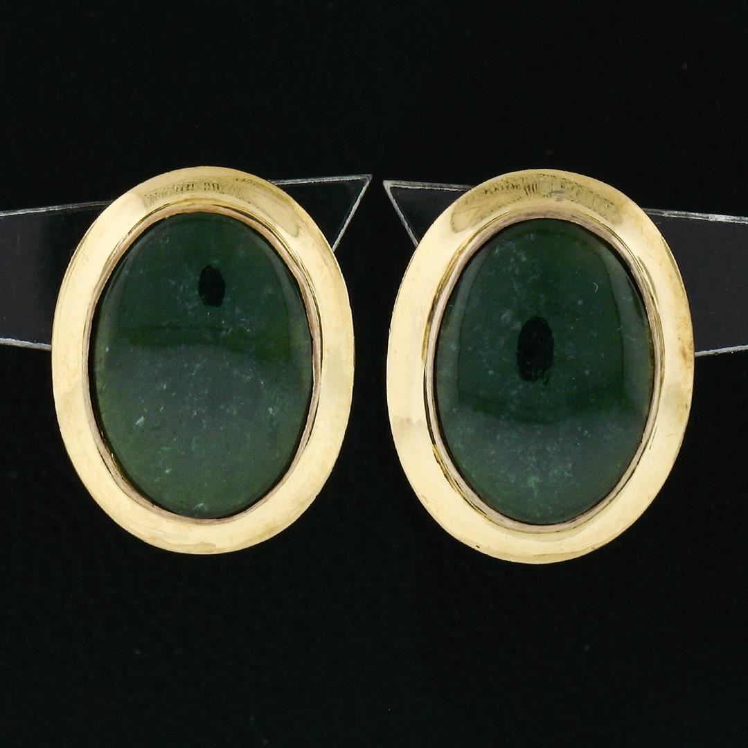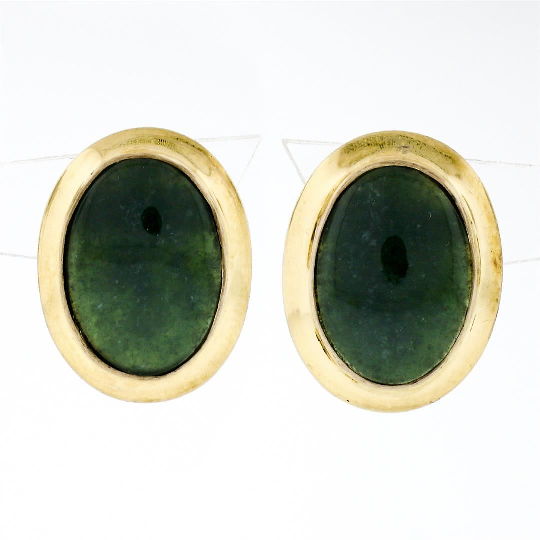 Vintage 14K Yellow Gold Oval Cabochon Cut Bezel Set Jade Classic Button Earrings. A vintage pair of solid 14k yellow gold earrings featuring a pair of oval cabochon cut, deep spinach green, natural jades (14.25x10.15mm). The earrings measure approximately