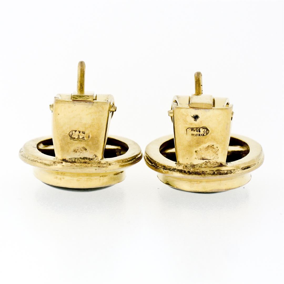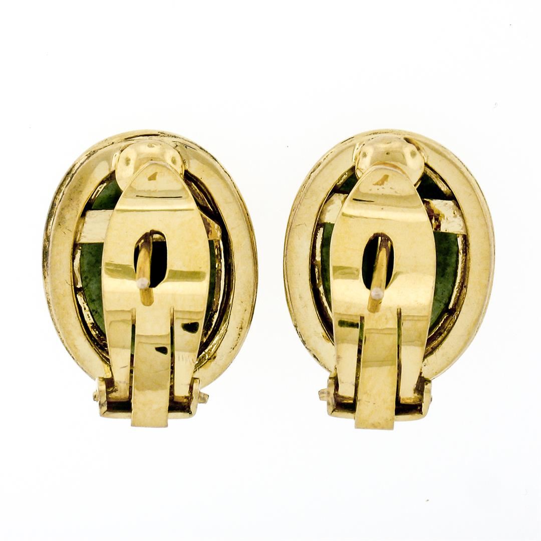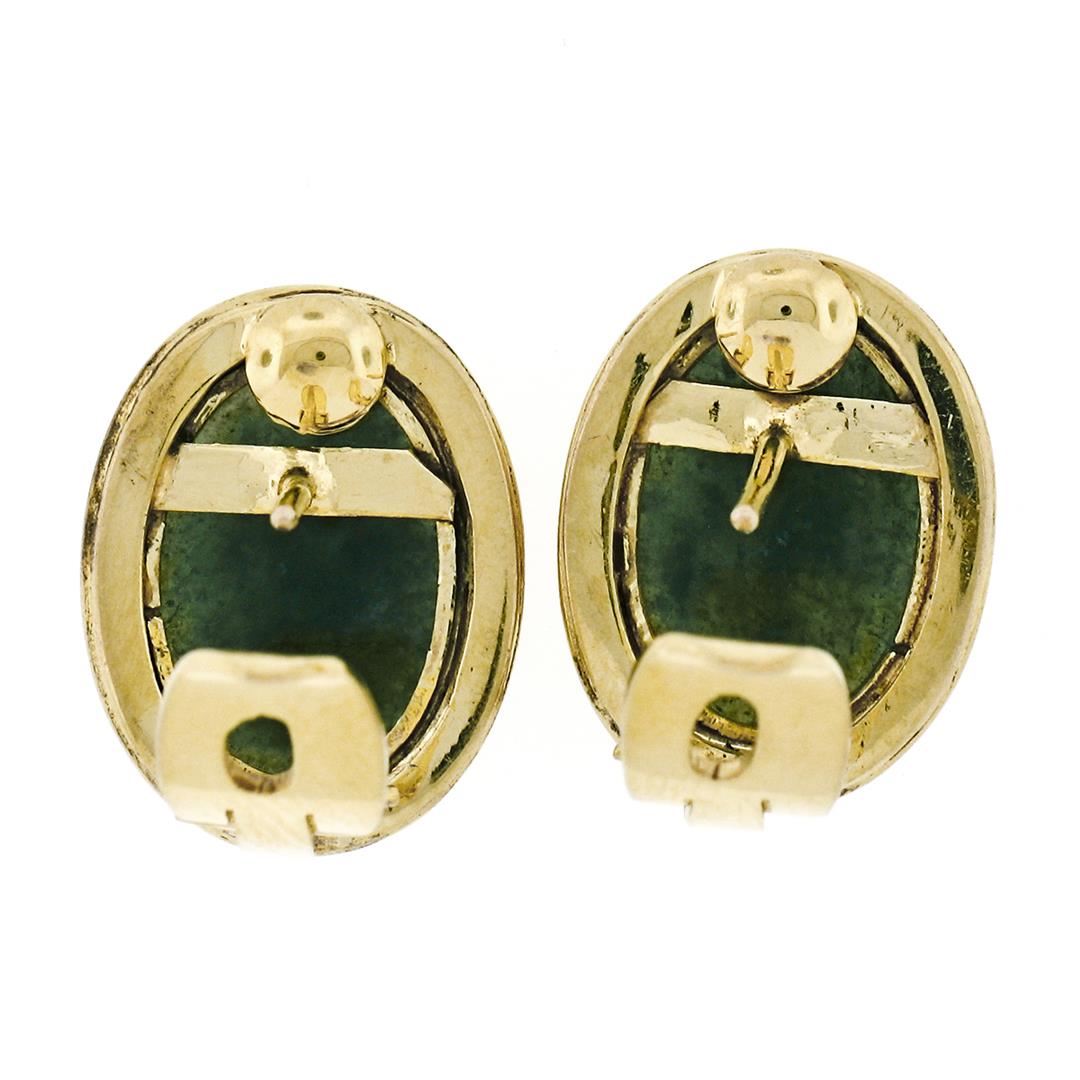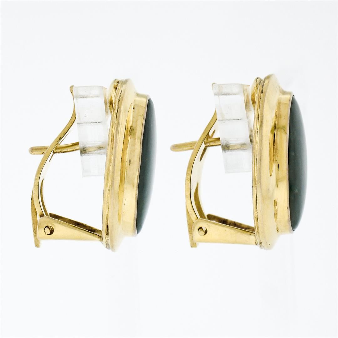 Vintage 14K Yellow Gold Oval Cabochon Cut Bezel Set Jade Classic Button Earrings. A vintage pair of solid 14k yellow gold earrings featuring a pair of oval cabochon cut, deep spinach green, natural jades (14.25x10.15mm). The earrings measure approximately