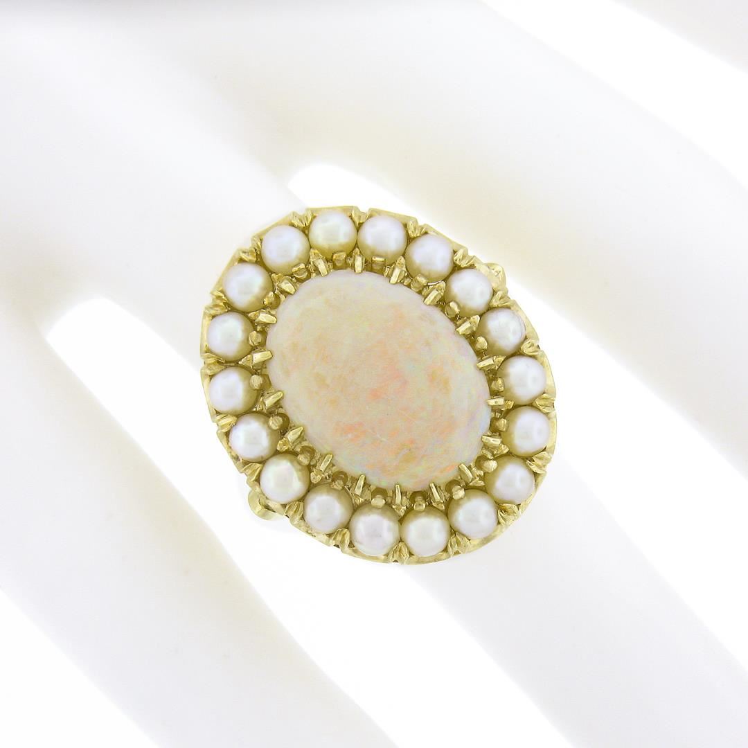 A vintage solid 14k yellow gold ring, with 1 oval cabochon cut natrual opal (16.3x12mm), surrounded with a halo of 18 bead shape cultured pearls (3 to 3.2mm). The ring is size 5.0, weighs a total of 11.27 grams, and measures 25.7mm wide.