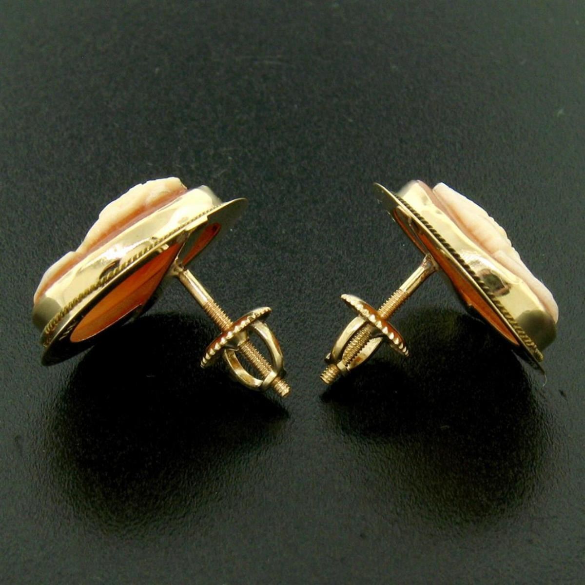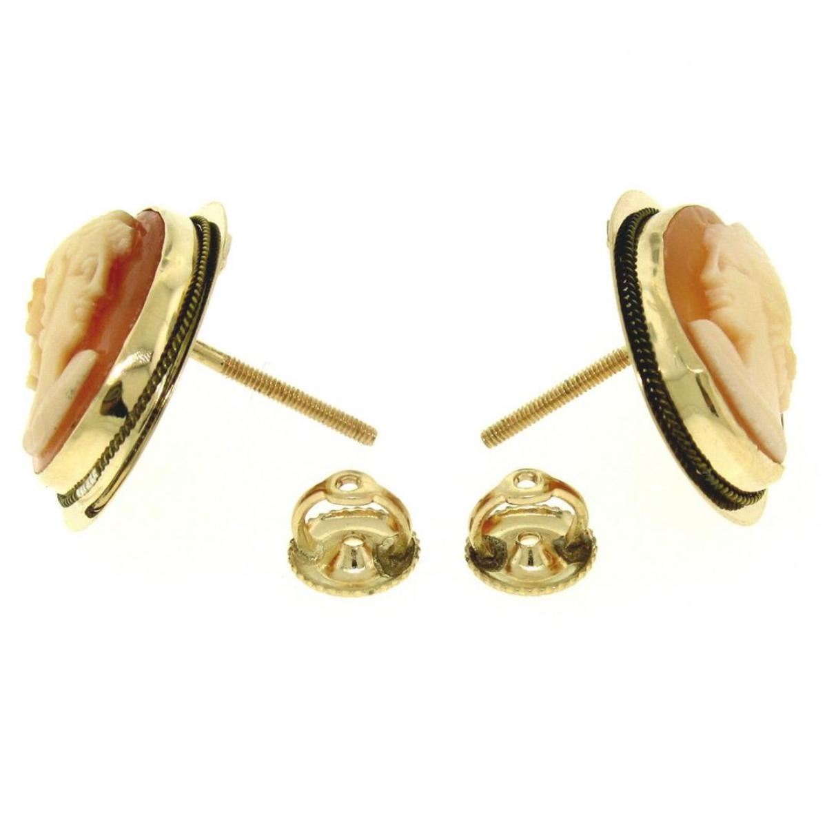 One Vintage 14K Yellow Gold Oval Carved Shell Cameo Framed Screw Back Stud Earrings. Item Details: Material: 14K Solid Yellow Gold, Weight: 4.4 Grams, Backing: Threaded Posts w/ Screw Backings, Width: 15.4mm, Height: 19mm, Thickness: 4.6mm, Condition: Vintage piece - Excellent condition!,