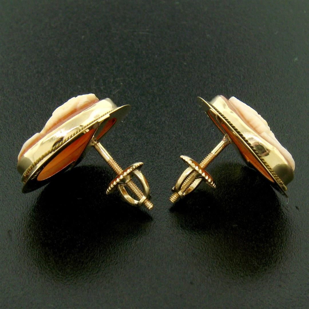 One Vintage 14K Yellow Gold Oval Carved Shell Cameo Framed Screw Back Stud Earrings. Item Details: Material: 14K Solid Yellow Gold, Weight: 4.4 Grams, Backing: Threaded Posts w/ Screw Backings, Width: 15.4mm, Height: 19mm, Thickness: 4.6mm, Condition: Vintage piece - Excellent condition!,