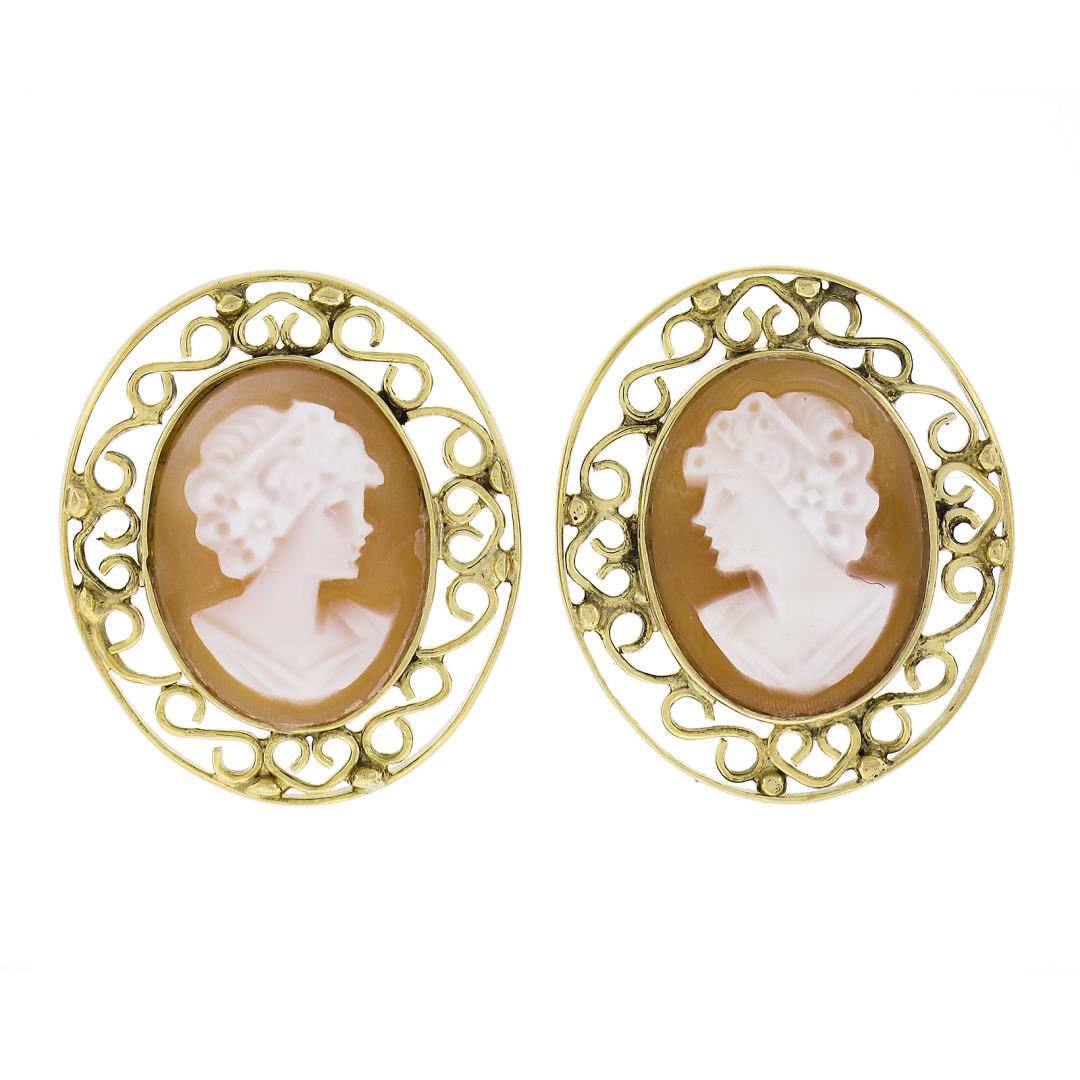 Vintage 14K Yellow Gold Oval Carved Shell Cameo Open Wire Frame Stud Earrings