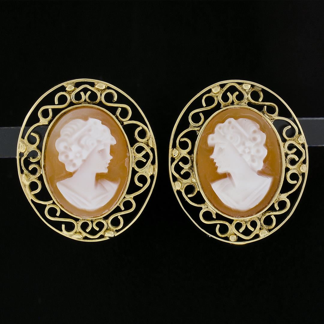 A vintage solid 14k yellow gold stud earrings, with 2 oval carved cameo shell. The earrings measure approximately 24.4x21mm and weigh a total of 8.25 grams.