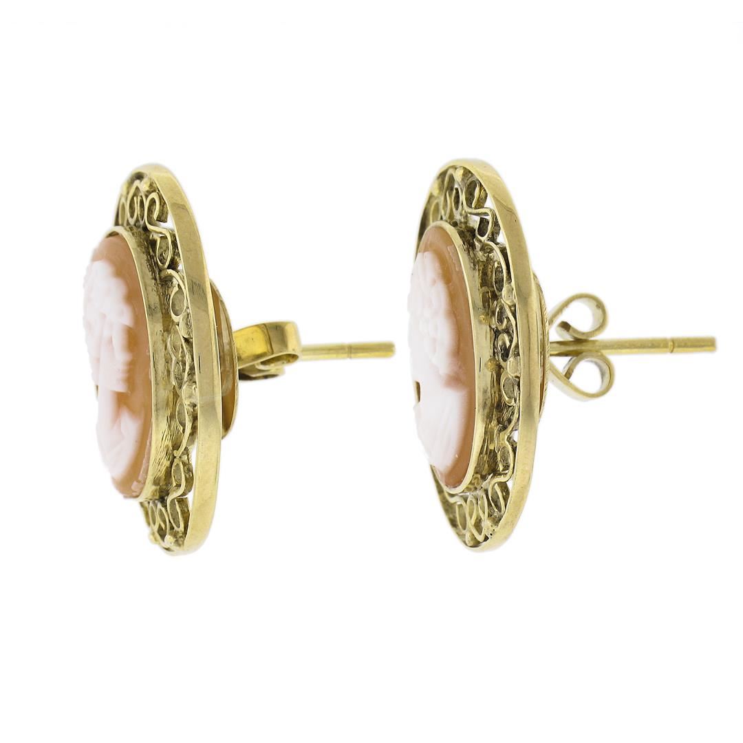 A vintage solid 14k yellow gold stud earrings, with 2 oval carved cameo shell. The earrings measure approximately 24.4x21mm and weigh a total of 8.25 grams.