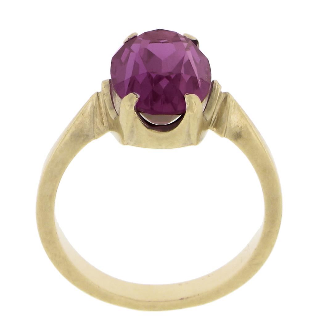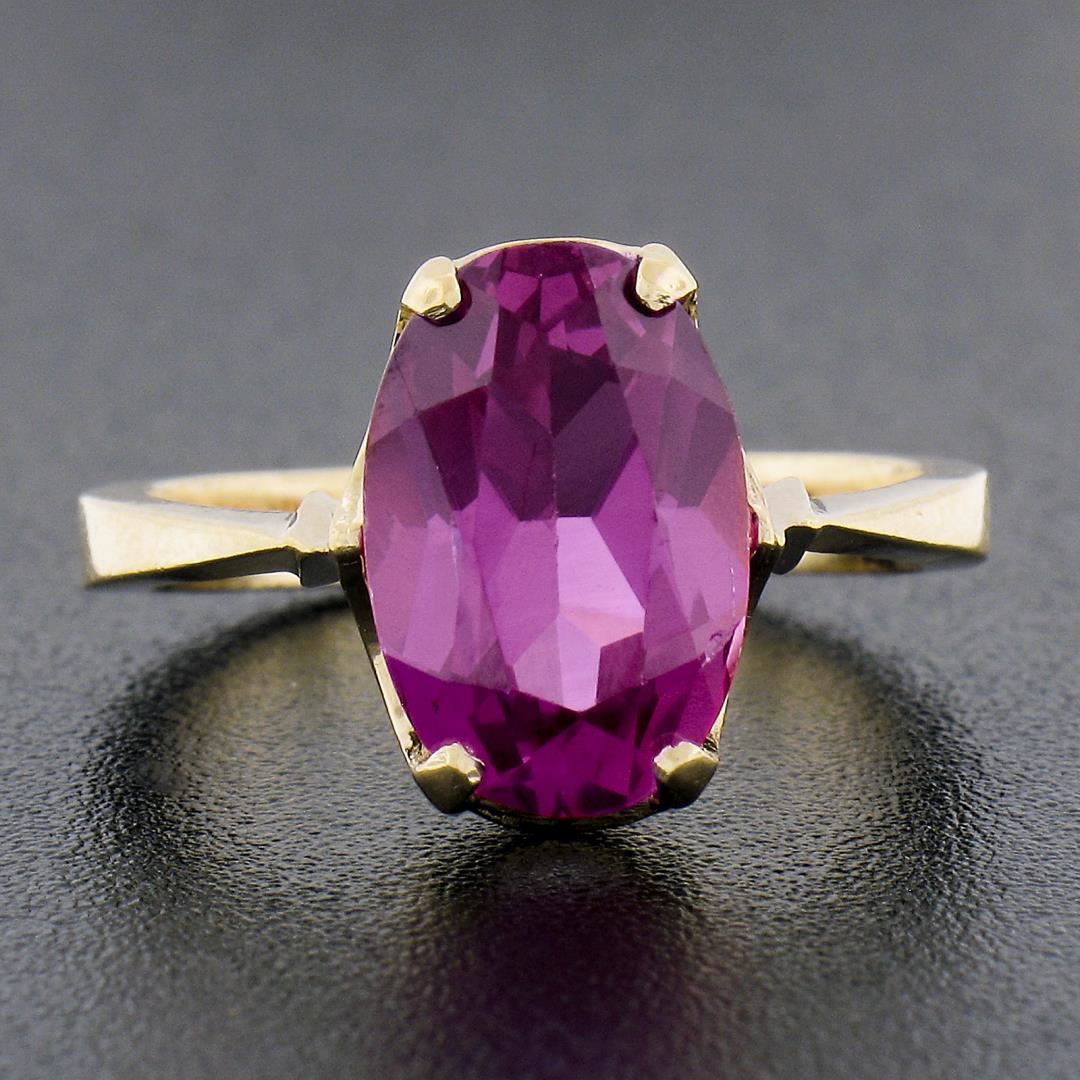 A vintage solid 14k yellow gold solitaire ring, with 1 oval cut pink stone (11.8x7.8mm). The ring is size 6.5, weighs a total of 3.79 grams, and measures 12.1mm wide.