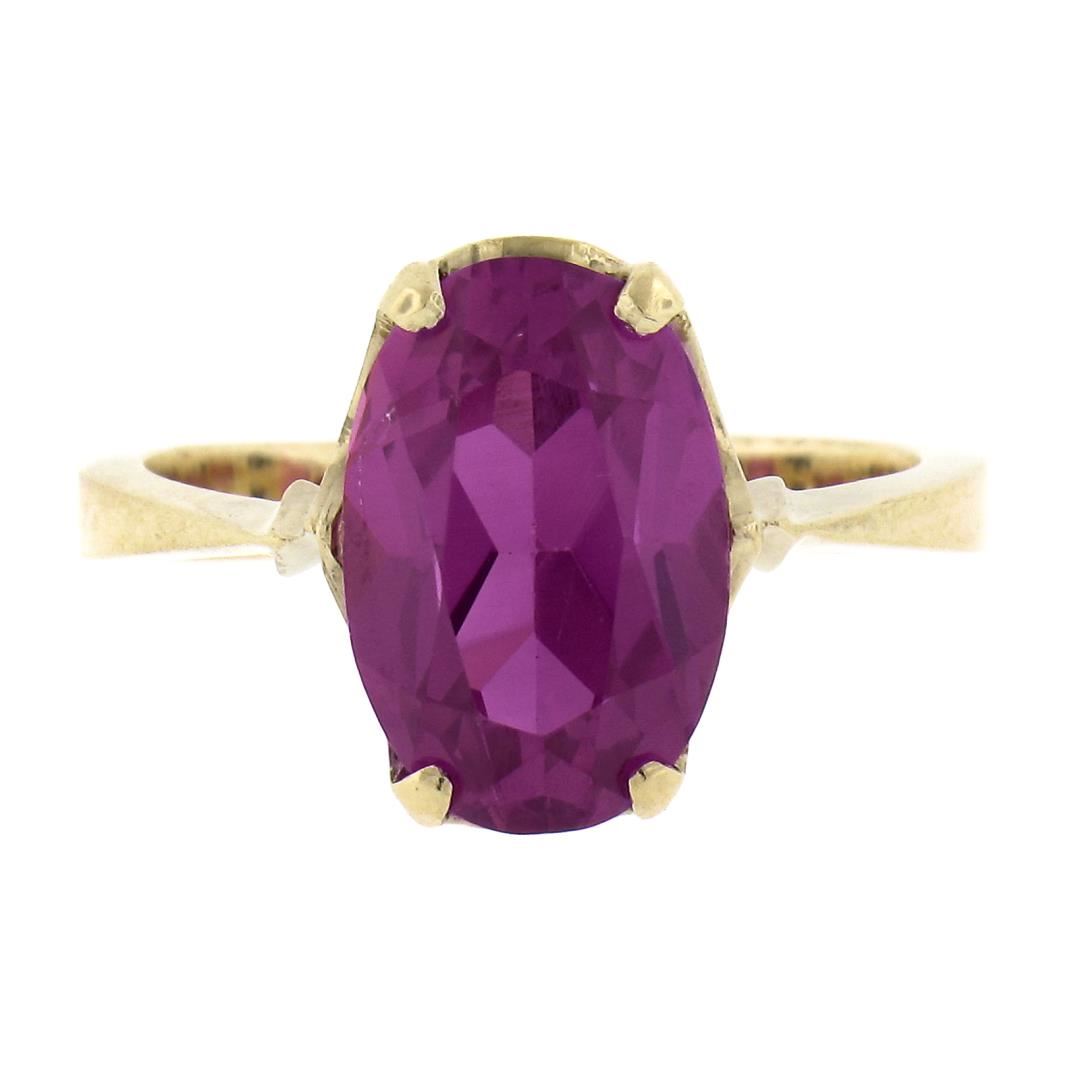 A vintage solid 14k yellow gold solitaire ring, with 1 oval cut pink stone (11.8x7.8mm). The ring is size 6.5, weighs a total of 3.79 grams, and measures 12.1mm wide.