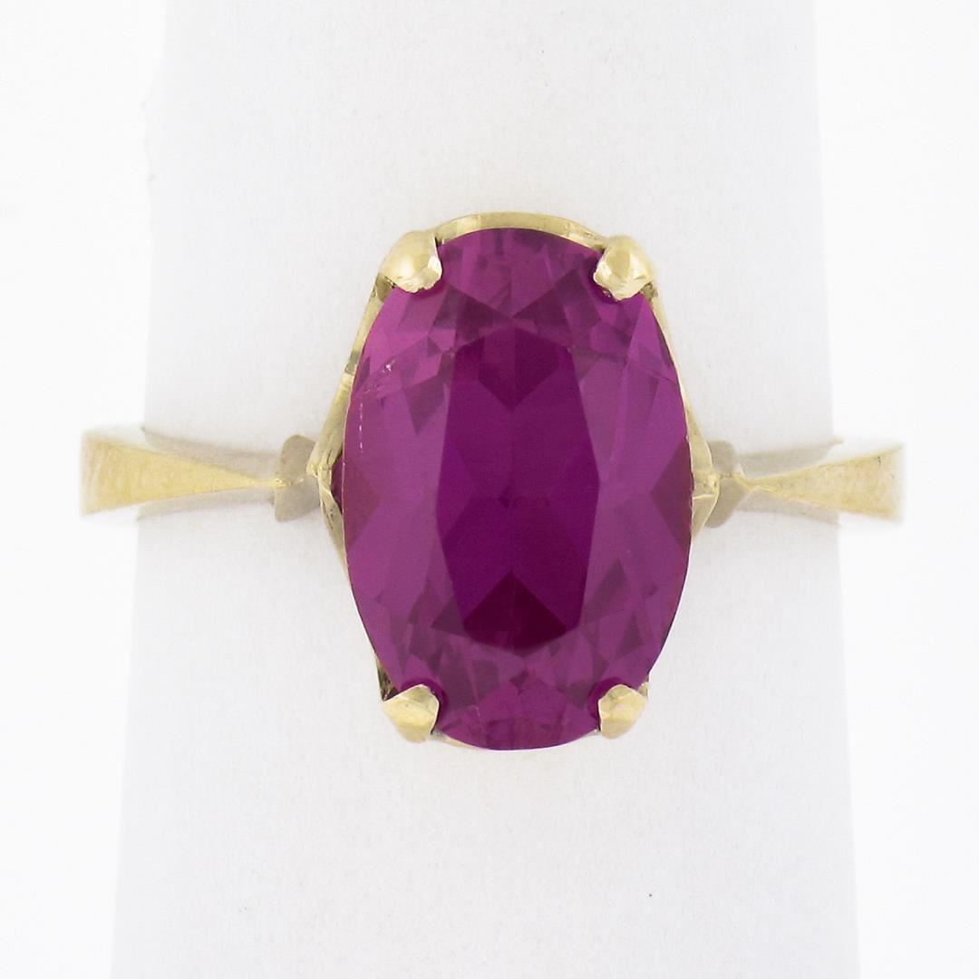 A vintage solid 14k yellow gold solitaire ring, with 1 oval cut pink stone (11.8x7.8mm). The ring is size 6.5, weighs a total of 3.79 grams, and measures 12.1mm wide.