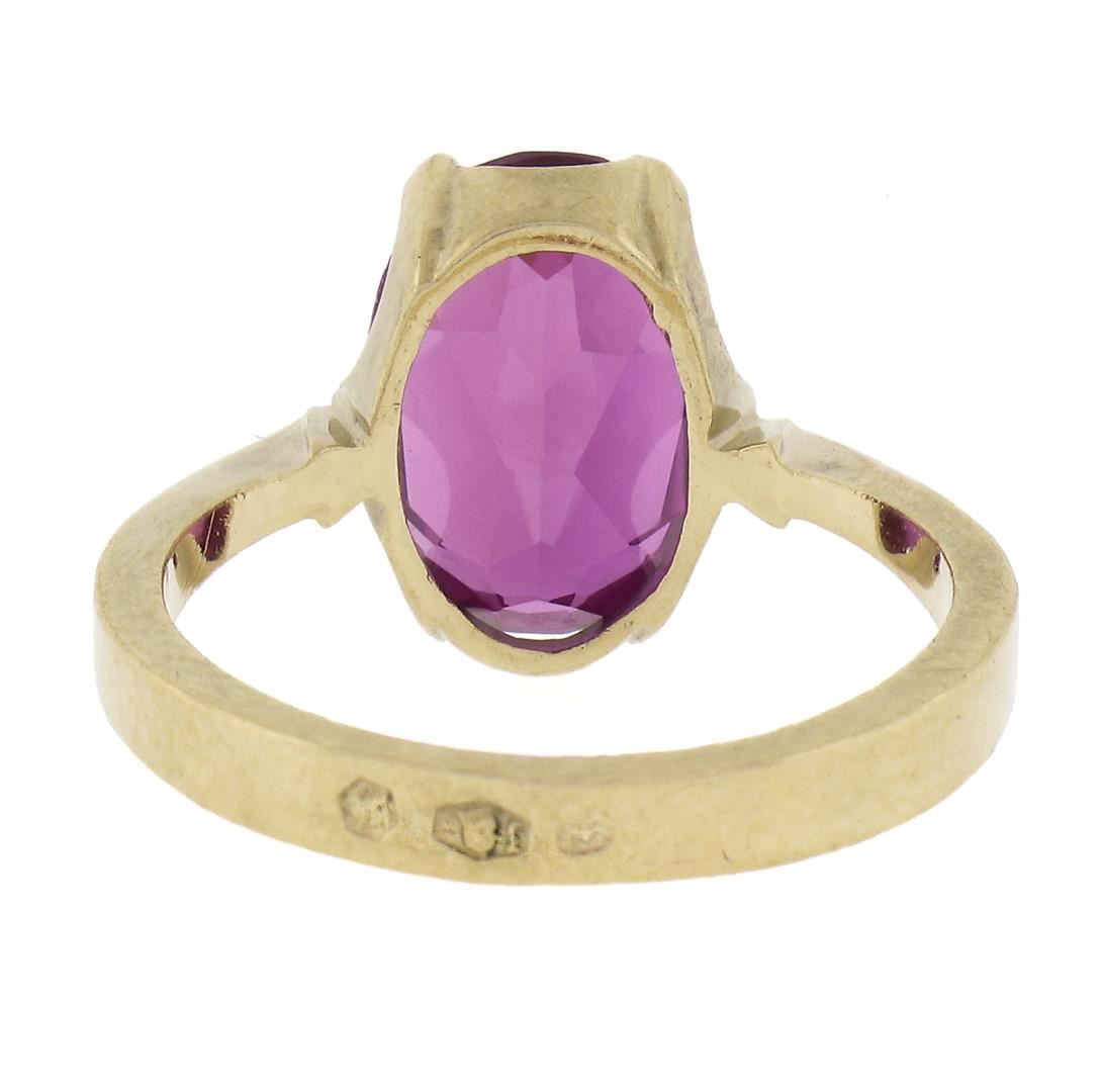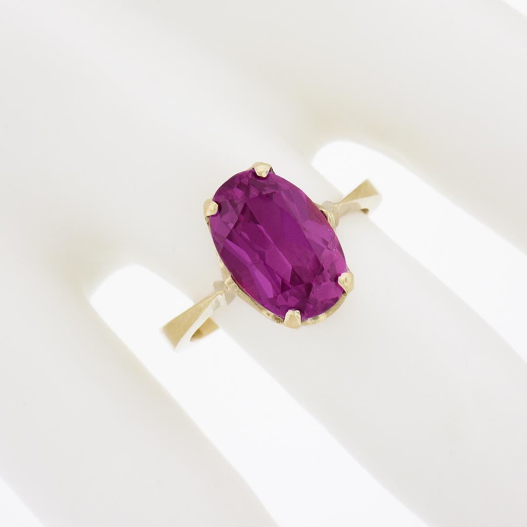 A vintage solid 14k yellow gold solitaire ring, with 1 oval cut pink stone (11.8x7.8mm). The ring is size 6.5, weighs a total of 3.79 grams, and measures 12.1mm wide.