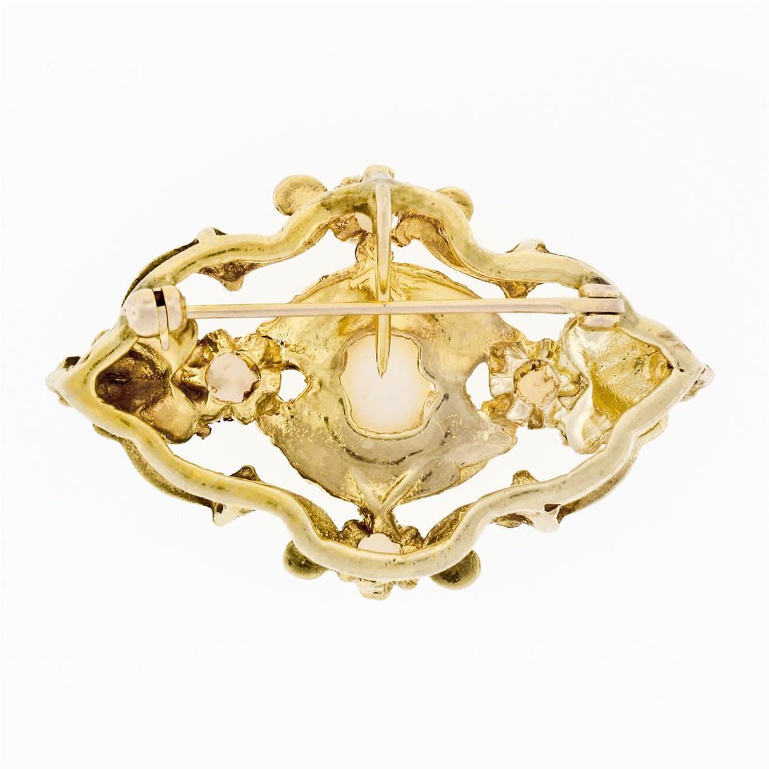 A vintage solid 14k yellow gold brooch pendant, with 1 oval cabochon cut natural opal (7.20x5.50mm), and 2 round cabochon cut natural opals (3.40-3.60mm). Measures 25.15x38.65mm and weighs a total of 8.54 grams.