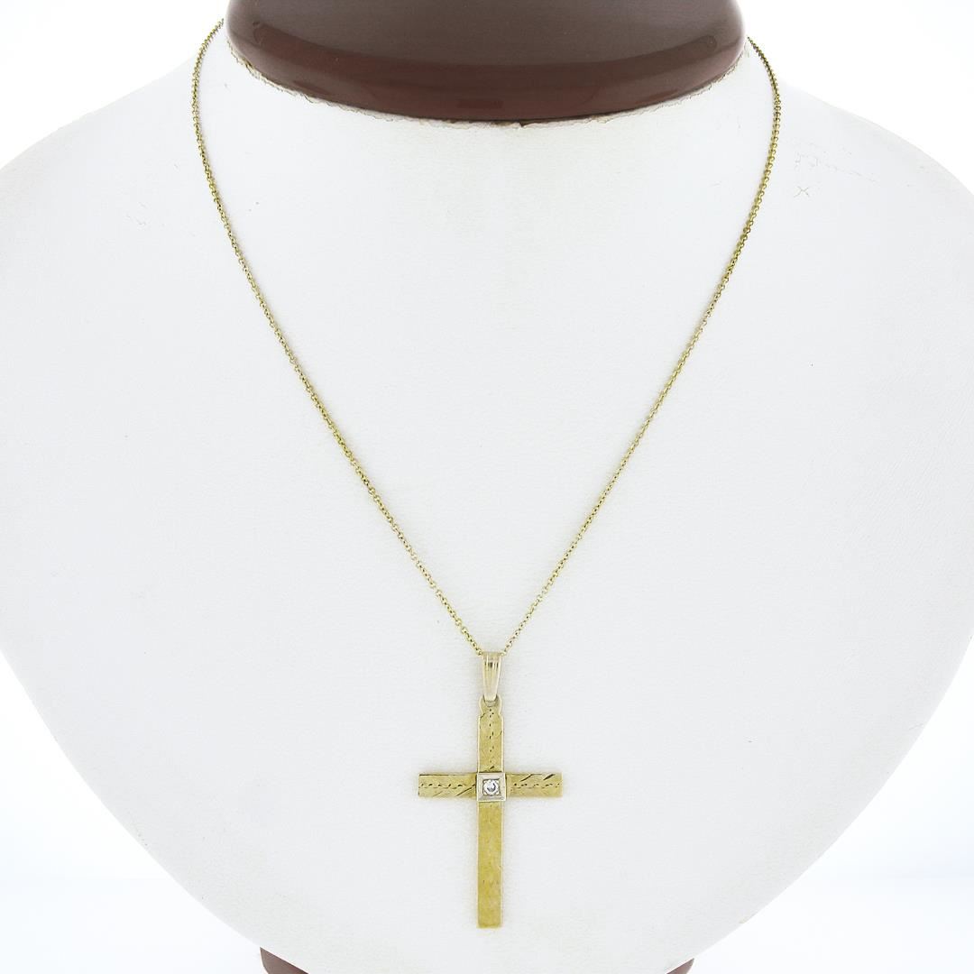 A vintage solid 14k yellow gold cross pendant necklace, with 1 old single cut natural diamond ( H - SI1 ; 0.03ctw). Adjustable at 18 & 20 inch cable link chain, 3.09 grams total weight, pendant measures 38.9x20.5mm.