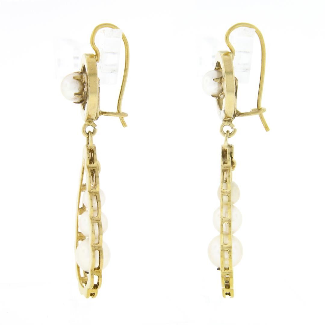 Vintage 14K Yellow Gold Pearl Scalloped Open Elongated Tear Drop Dangle Earrings