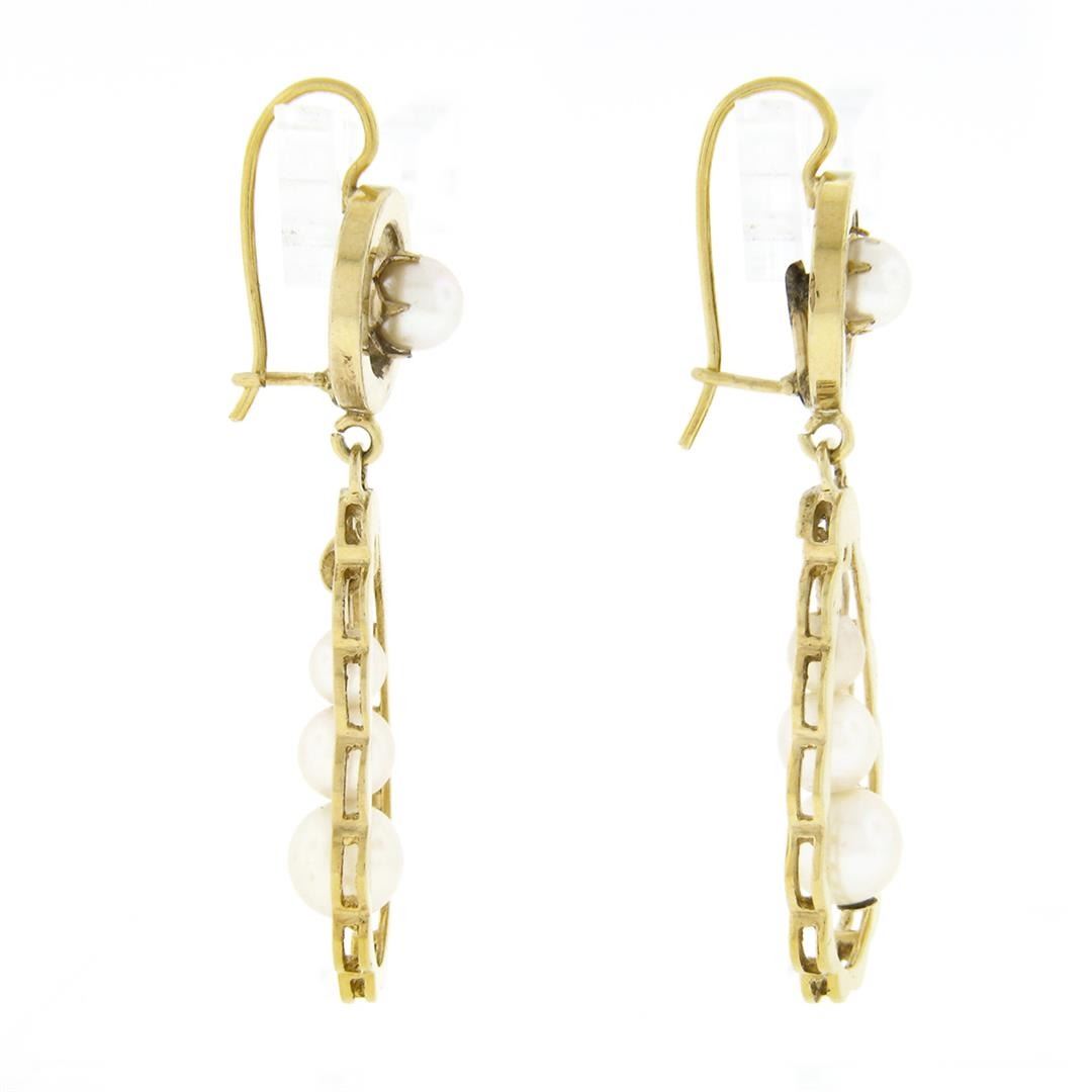 A vintage solid 14k yellow gold tear drop dangle earrings, with 8 round shape cultured pearls (4.0mm to 6.0mm). The earrings measure approximately 47.20x13.5mm and weigh a total of 7.0 grams.