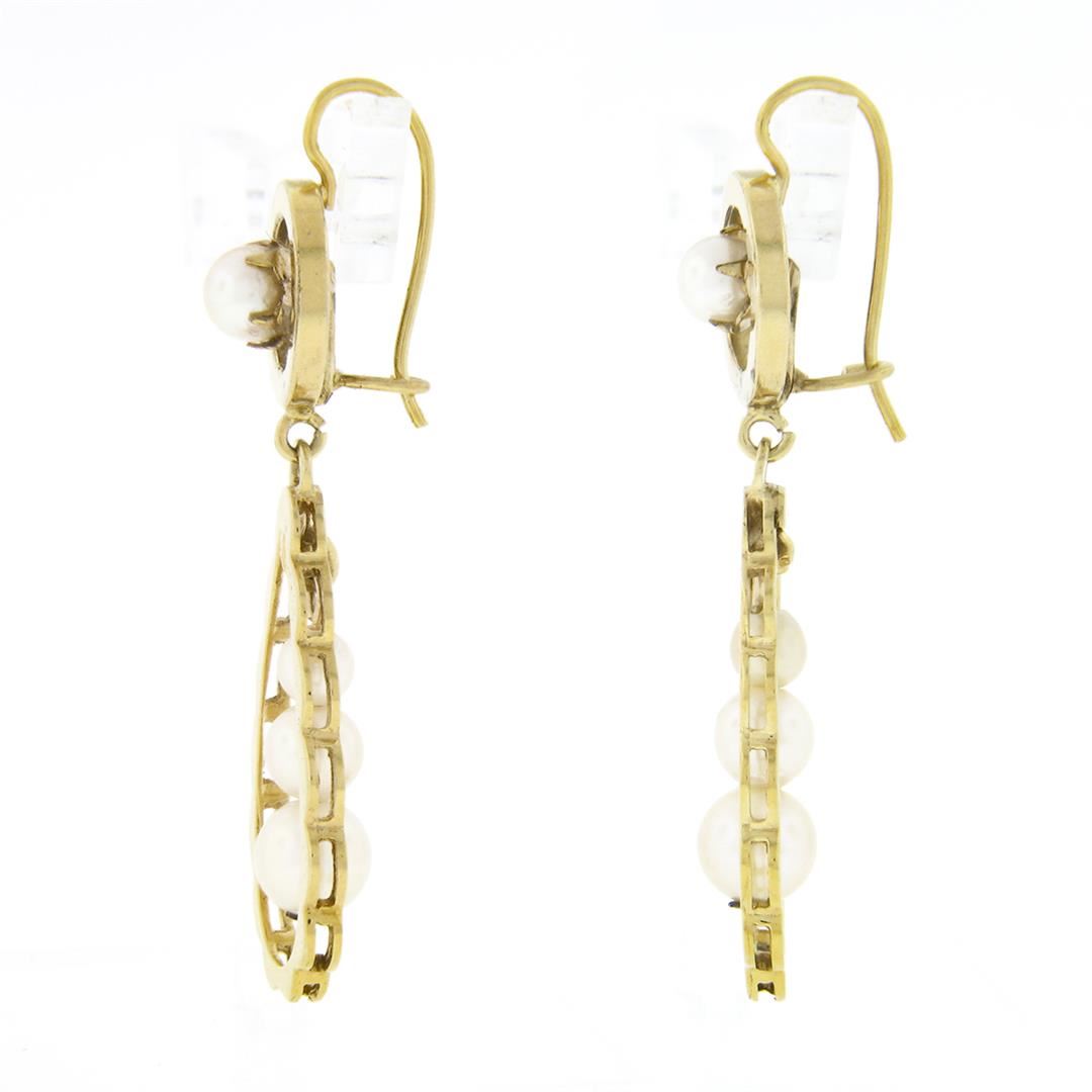 A vintage solid 14k yellow gold tear drop dangle earrings, with 8 round shape cultured pearls (4.0mm to 6.0mm). The earrings measure approximately 47.20x13.5mm and weigh a total of 7.0 grams.