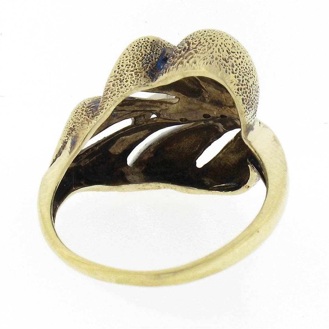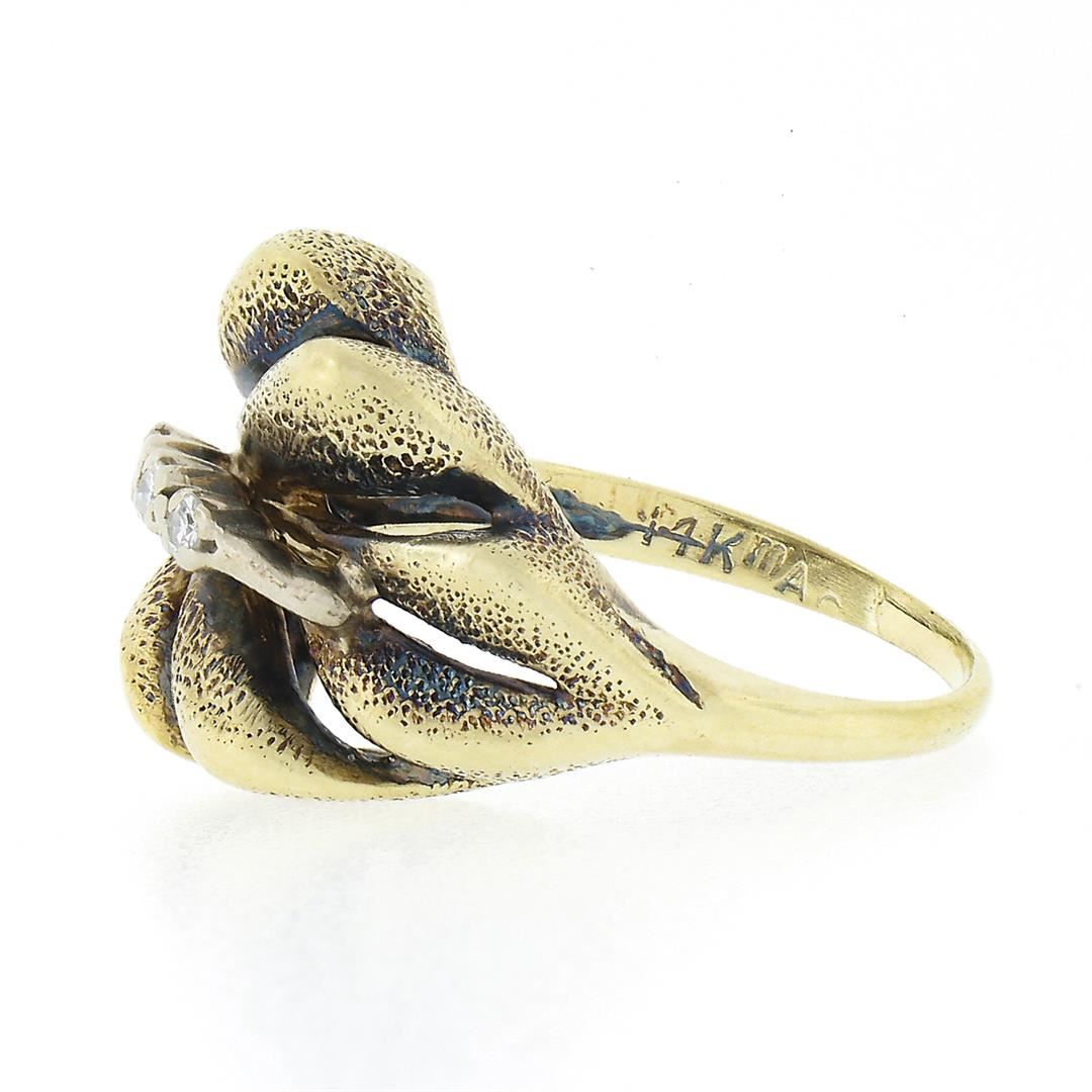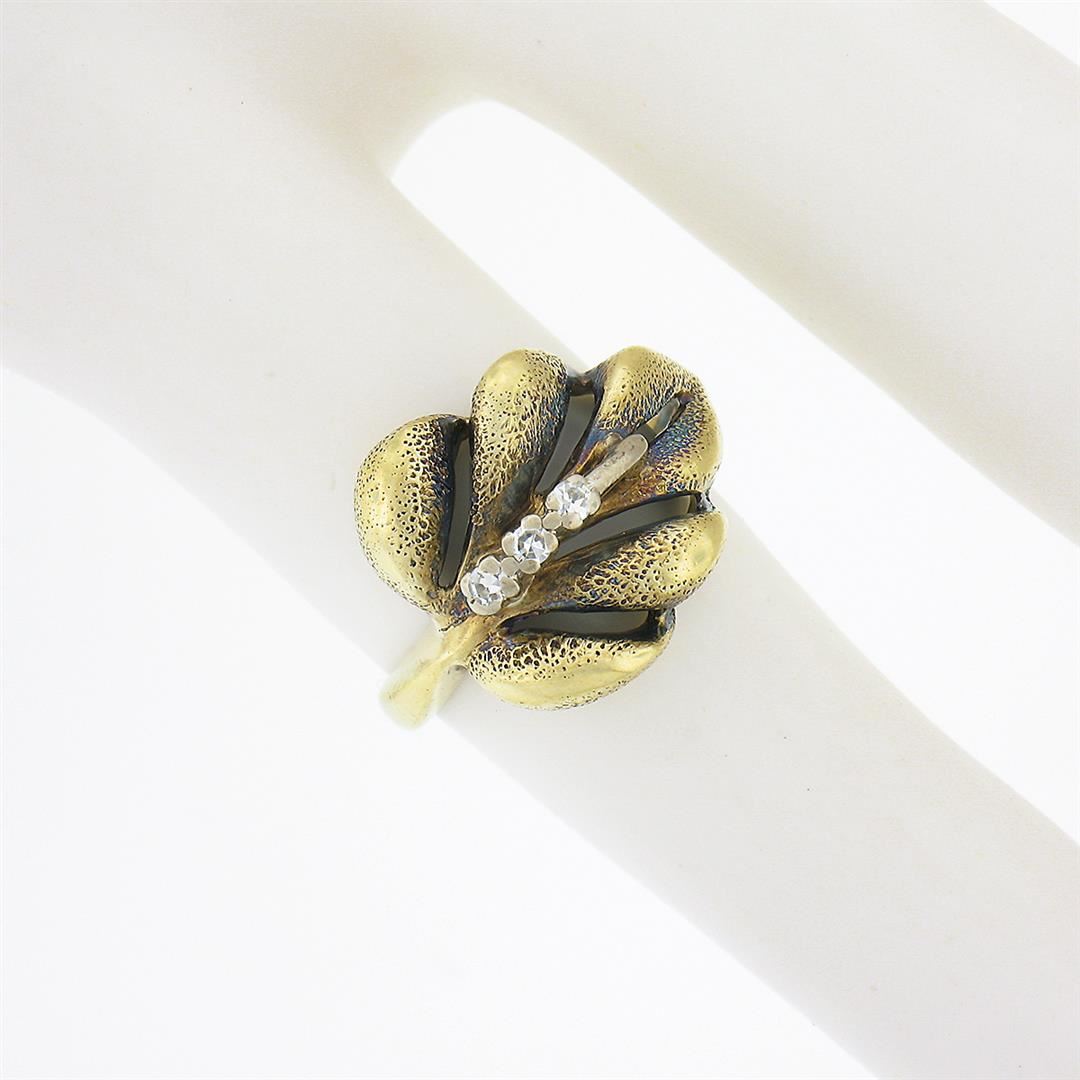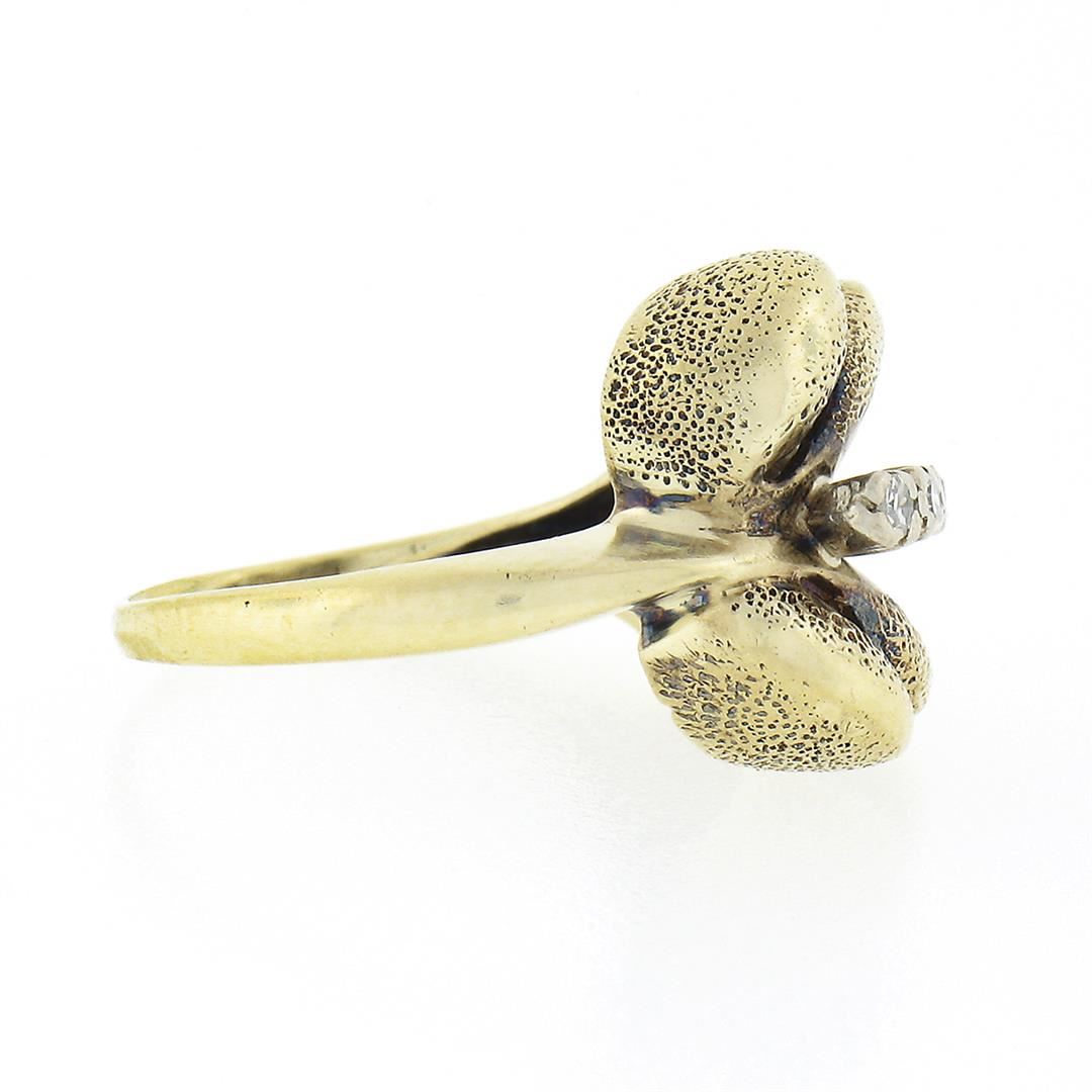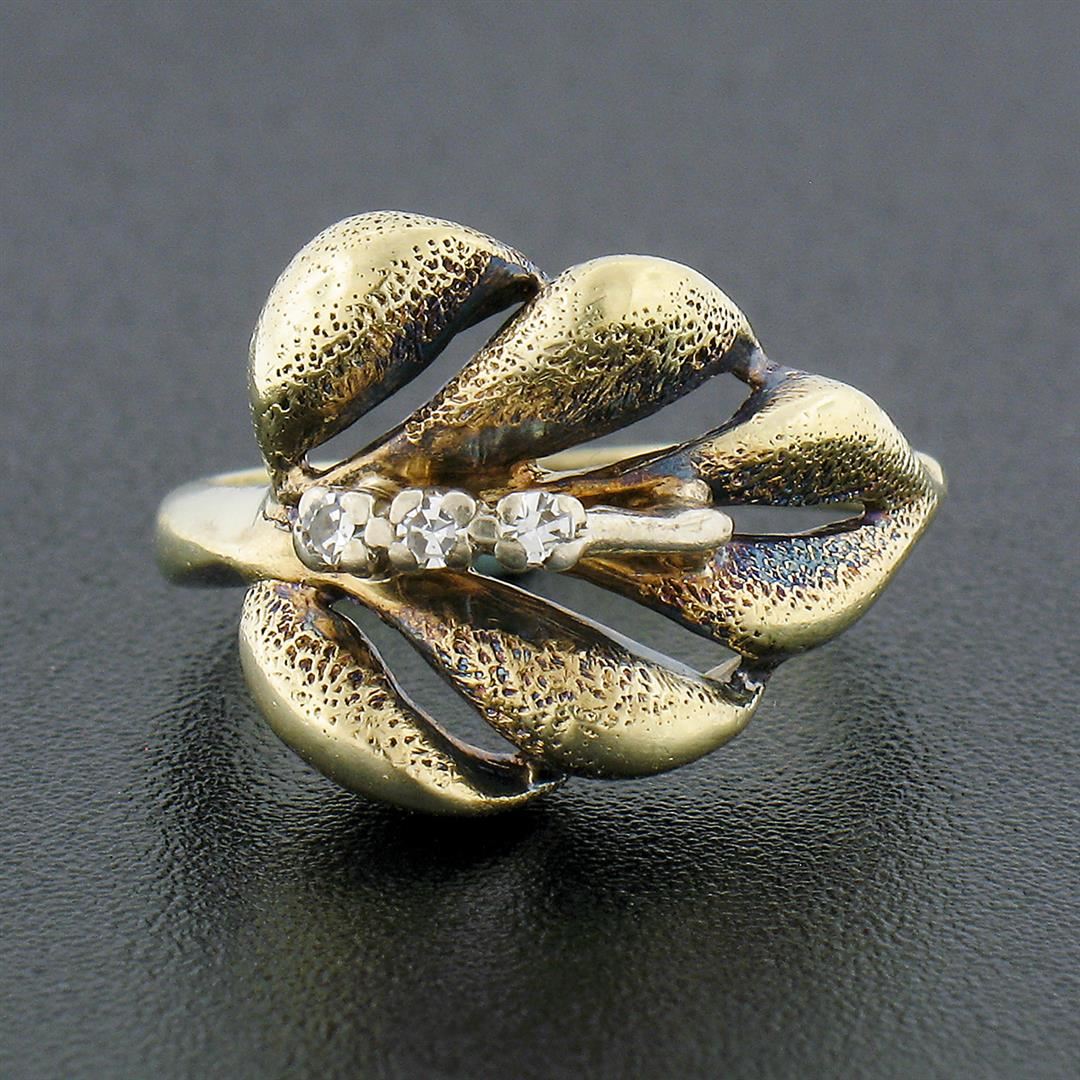 A vintage solid 14k yellow gold ring, with 3 old single cut natural diamonds (G - VS2 ; 0.3ctw). The ring is size 3.5, weighs a total of 3.8 grams, and measures 12.8mm wide.