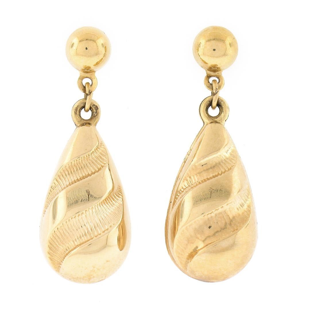 A vintage solid 14k yellow gold tear drop dangle earrings. The earrings measure approximately 25x9mm and weigh a total of 1.31 grams.