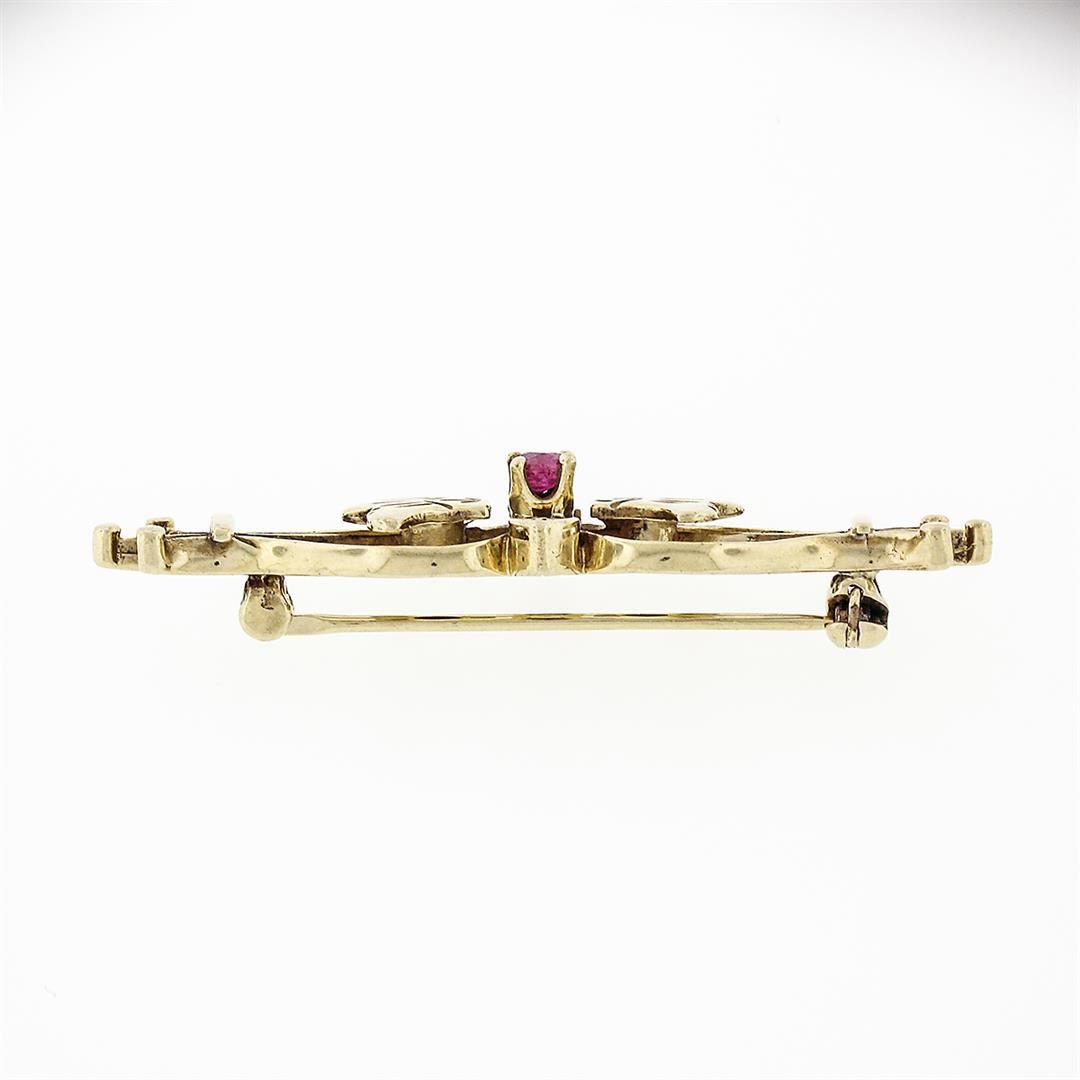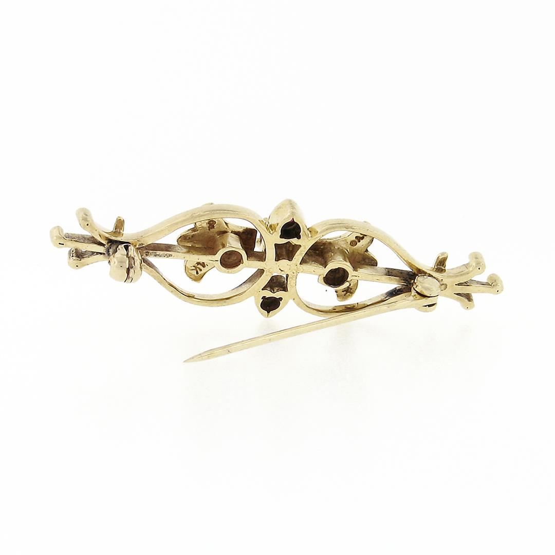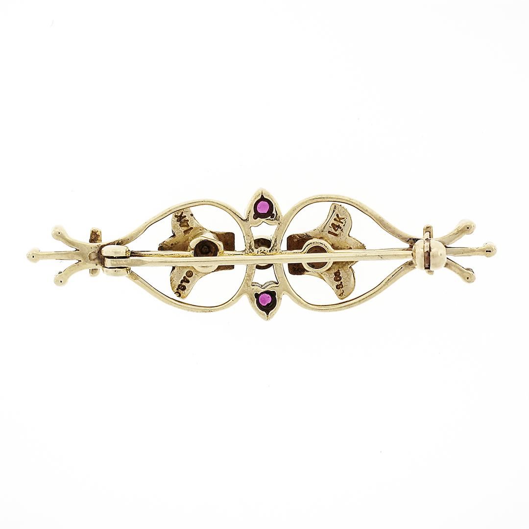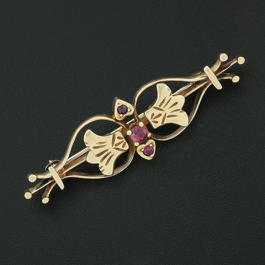 A solid 14k yellow gold foliage bar pin brooch, with 3 round brilliant cut natural rubies (3mm to 1.6mm ; 0.21ctw). Measures 12.6x44.2mm and weighs a total of 4.87 grams.