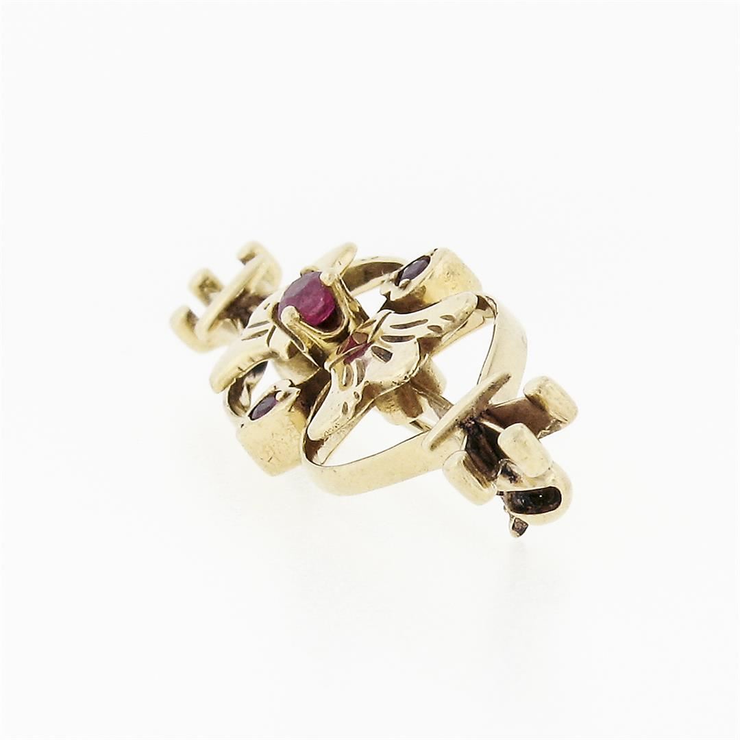 A solid 14k yellow gold foliage bar pin brooch, with 3 round brilliant cut natural rubies (3mm to 1.6mm ; 0.21ctw). Measures 12.6x44.2mm and weighs a total of 4.87 grams.