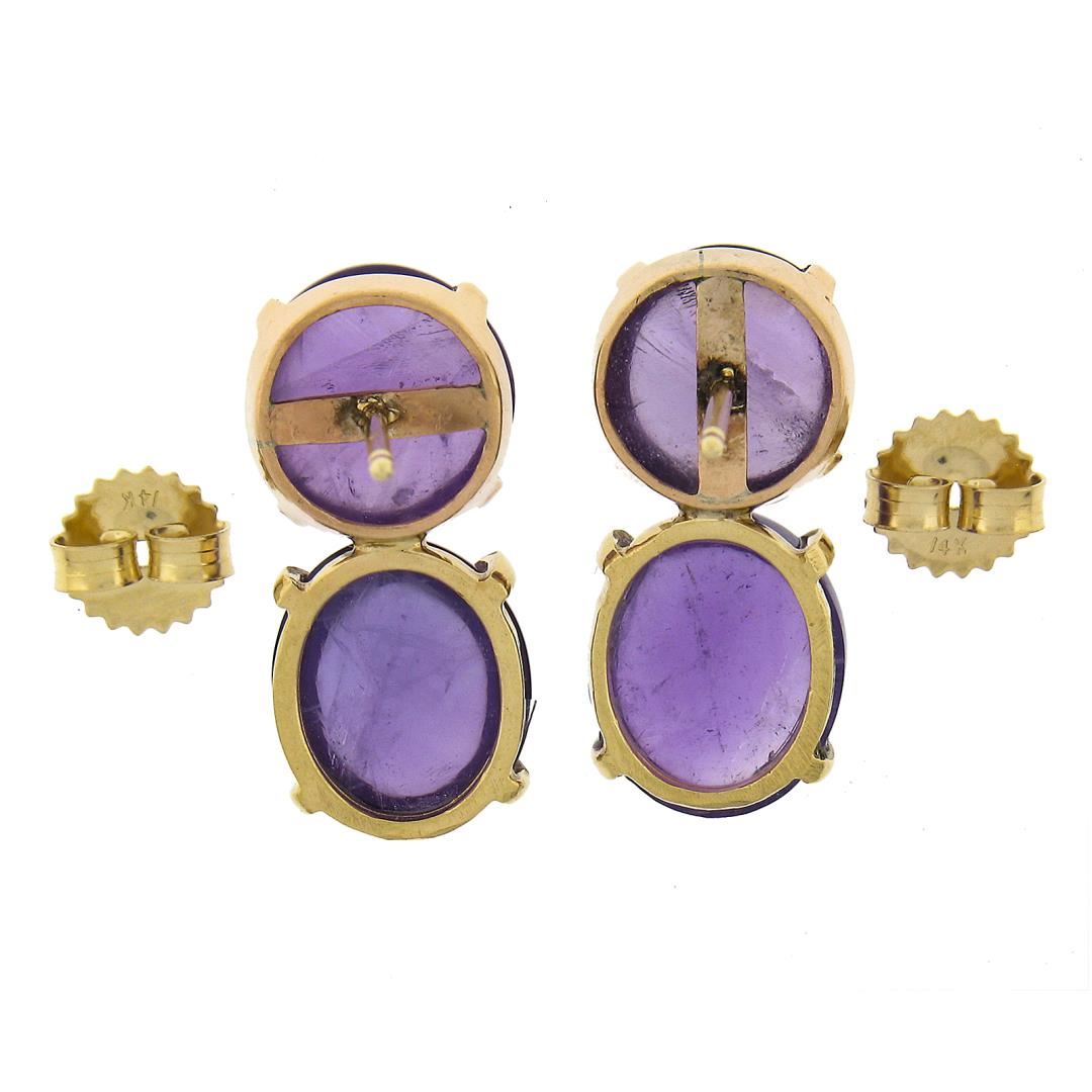 Vintage 14K Yellow Gold Round & Oval Cabochon Cut Amethyst Drop Dangle Earrings