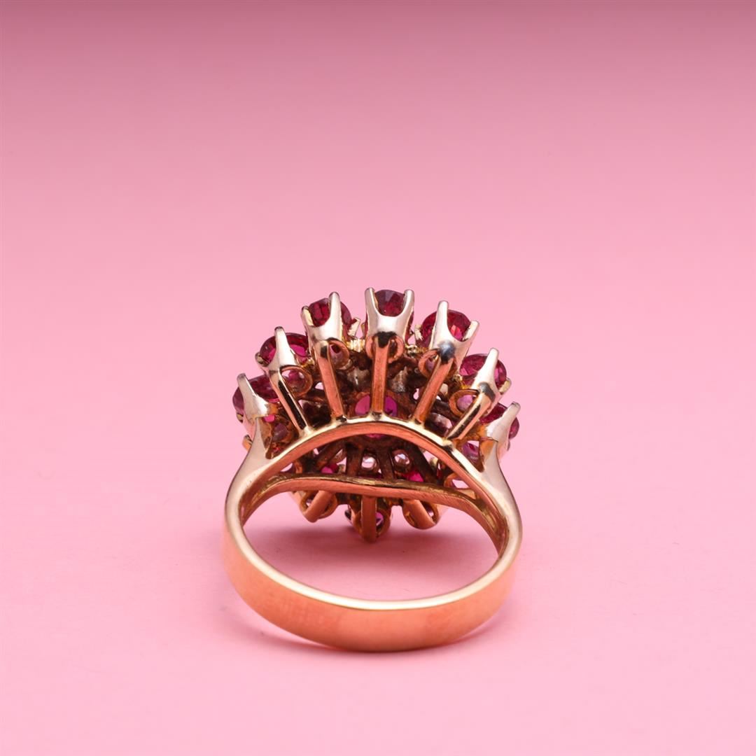Vintage 14K Yellow Gold Ruby & Diamond Cluster Ring containing thirteen oval rubies weighing approximately 2.60 cts. Ten round cut brilliant diamonds weighing approximately 0.25 cts. Total weight of ring is 7.3 gm. Estimated retail value $3,000.