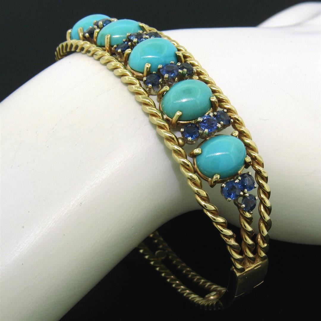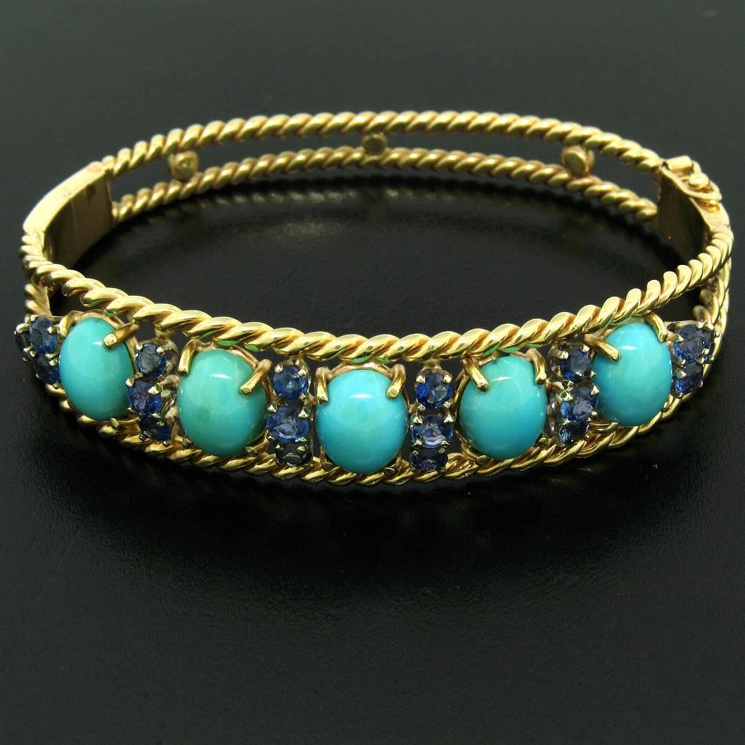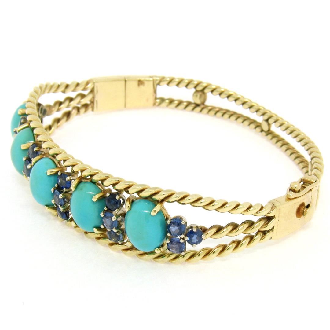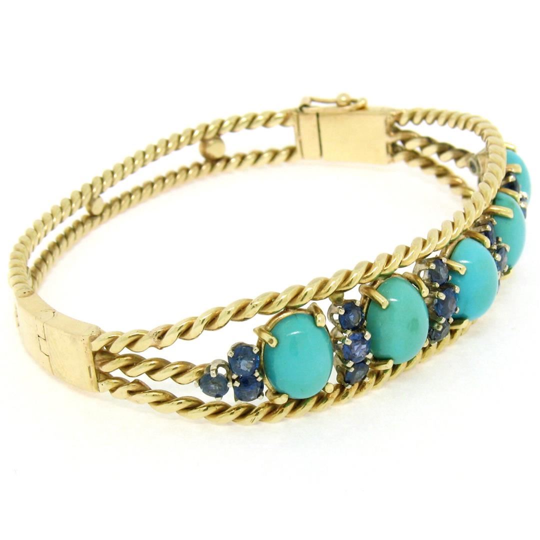 Vintage 14K Yellow Gold Sapphire & Turquoise Twisted Wire Open Bangle Bracelet. Please see photos and description for all available information. A vintage solid 14k yellow gold bangle bracelet, with 5 oval cabochon cut natural turquoise (10.0x7.4mm), and 18 round old cut natural sapphires (4.00ctw). It weighs a total of 25.03 grams, measures 65.30mm wide, and measures 6.75 inches in length.