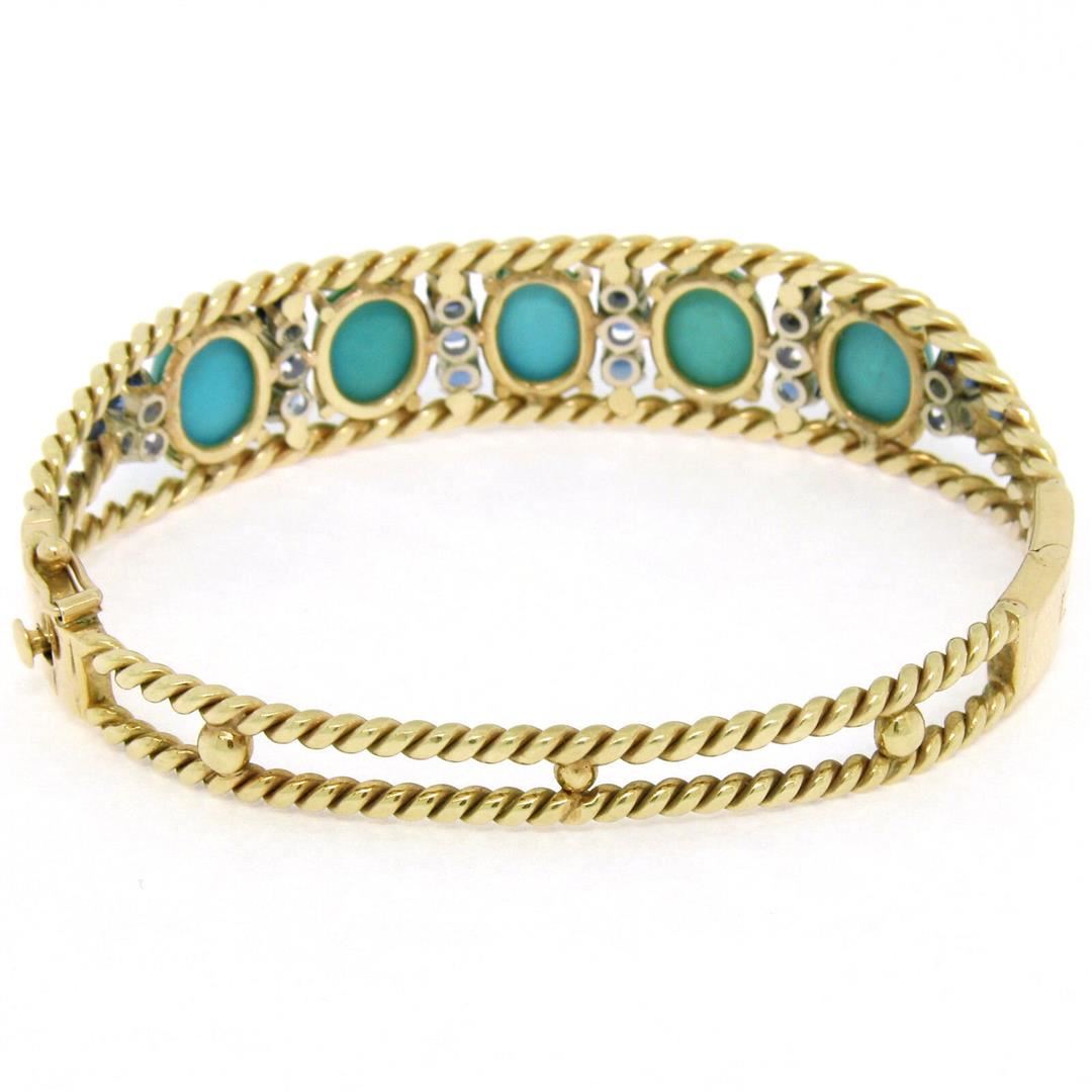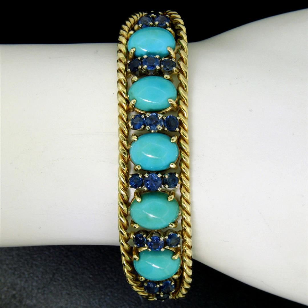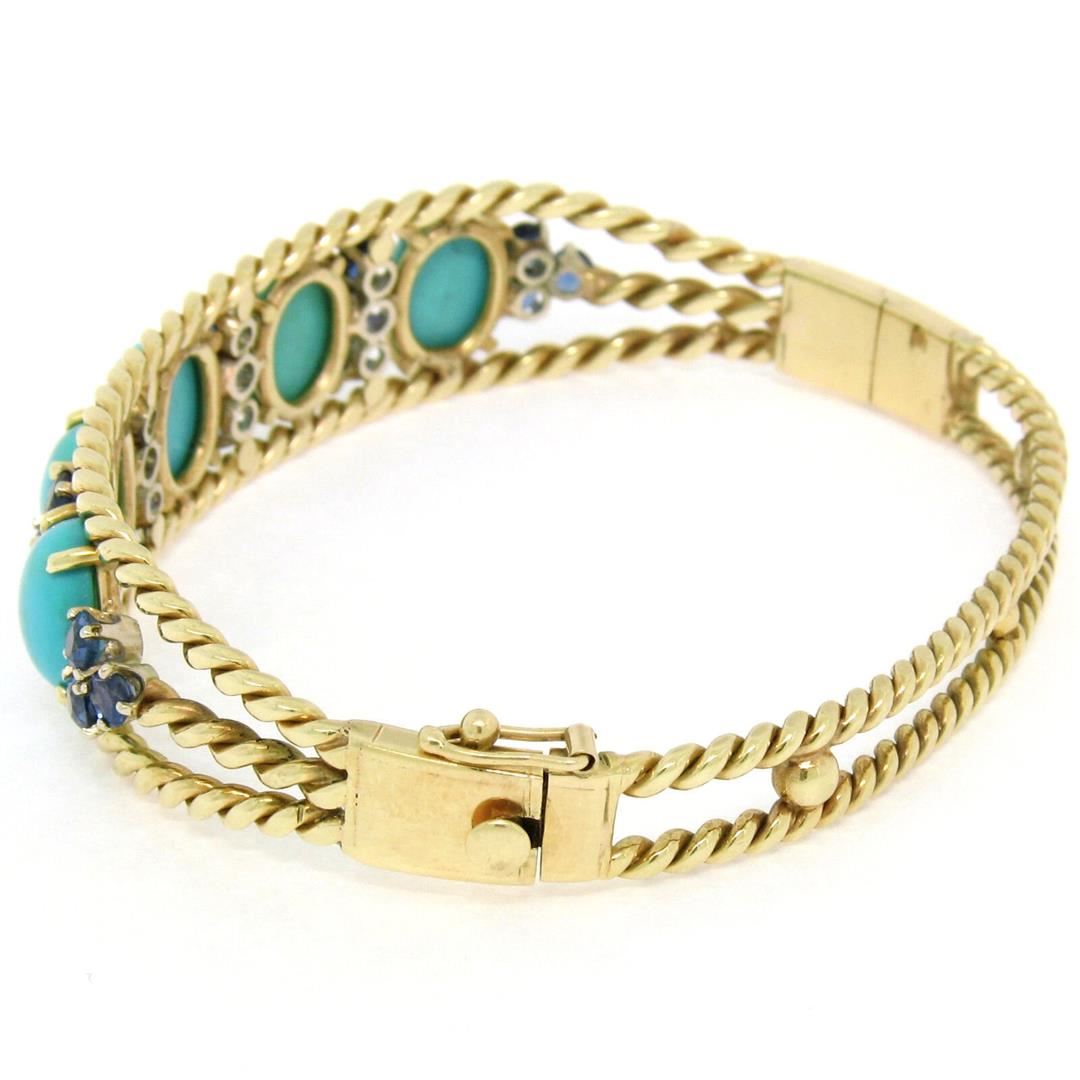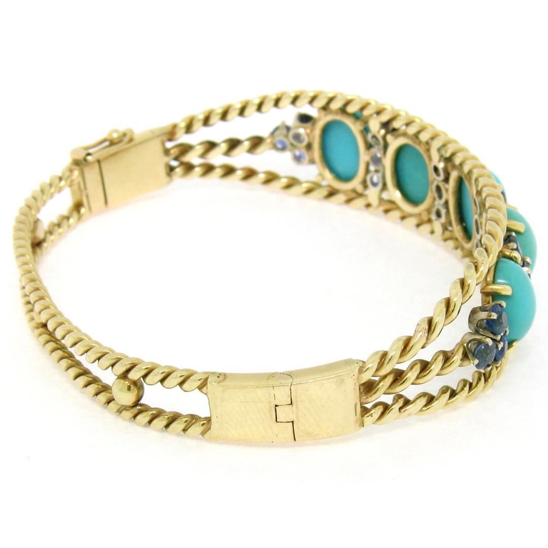 Vintage 14K Yellow Gold Sapphire & Turquoise Twisted Wire Open Bangle Bracelet. Please see photos and description for all available information. A vintage solid 14k yellow gold bangle bracelet, with 5 oval cabochon cut natural turquoise (10.0x7.4mm), and 18 round old cut natural sapphires (4.00ctw). It weighs a total of 25.03 grams, measures 65.30mm wide, and measures 6.75 inches in length.