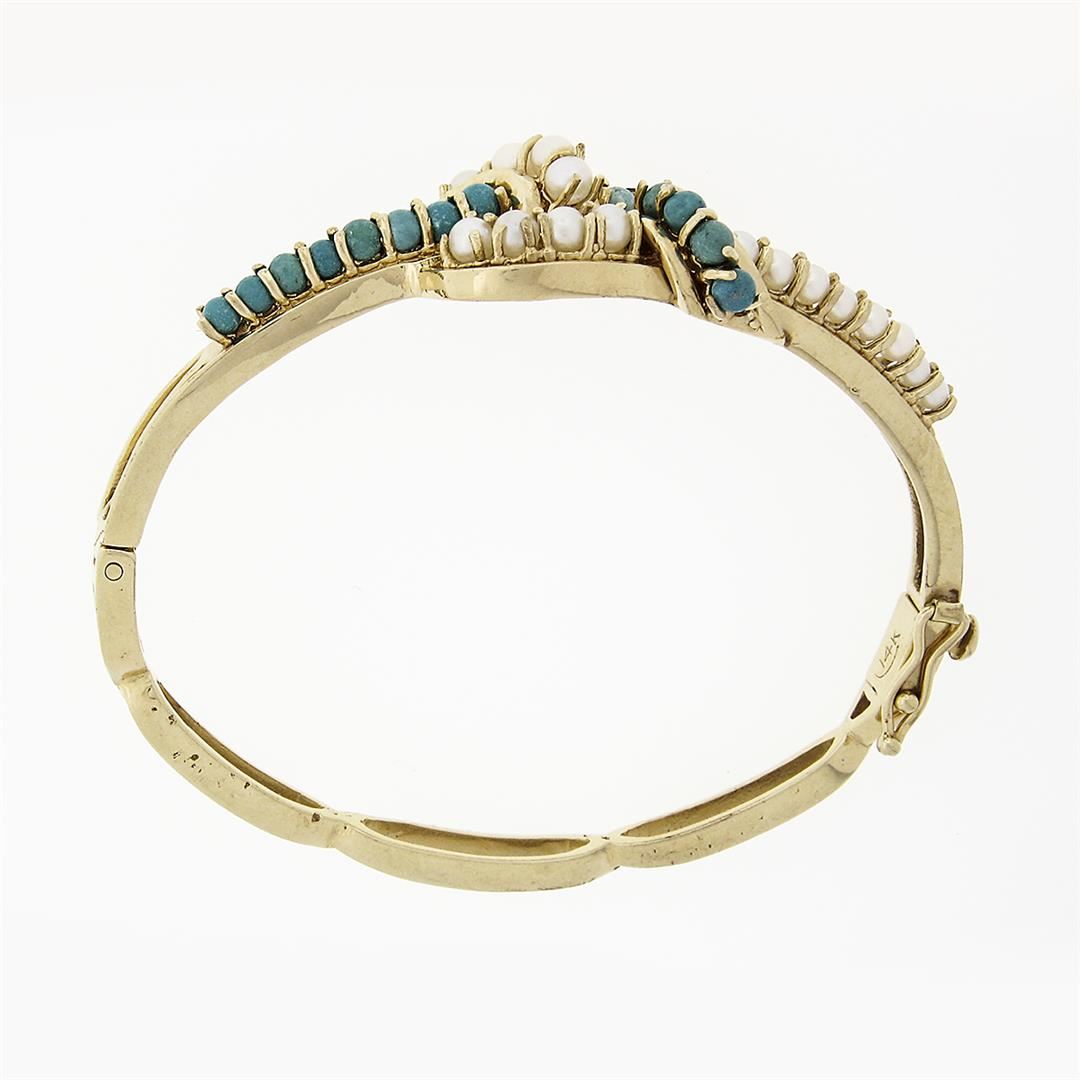 A vintage solid 14k yellow gold knot hinged bracelet, with 16 bead shape natural turquoise (2.6 to 3.0mm), & 16 round shape natural cultured pearls (2.4 to 3.2mm). It weighs a total of 21.05 grams, measures 21mm wide, and measures 6.25 inches in length.